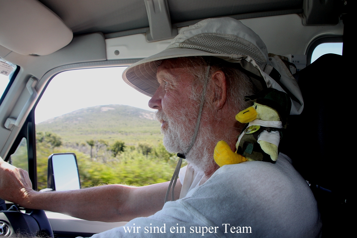 Gerade als sie die vollen Teller auf den Tisch gestellt hatte, kamen 2 Parkranger vorbei, um die Campingplatzgebühr zu kassieren. Da wir vorerst 2 Nächte bleiben wollten, zahlten wir 28,- $. Die Ranger konnten uns auch den Namen der Schlange nennen, eine hier ziemlich häufig vorkommende Dugite, und auf unsere Frage, ob sie giftig sei, antworteten sie mit typisch australischem Understatement "not nice", also ziemlich gefährlich. Zum Abendessen tranken wir zusammen 3 Dosen Bier, was Entelchen sehr erfreute. Danach wieder Spülen. Um 19.30 h war es dunkel draußen und wir zogen uns ins Auto zurück, Tagebuch schreiben und Bilder schauen. Müde gingen wir gegen 21.00 h schlafen. |