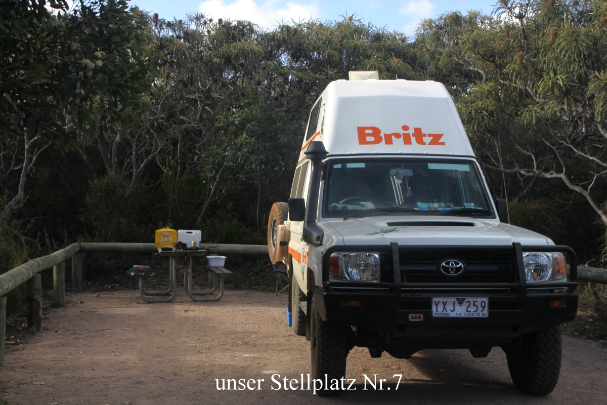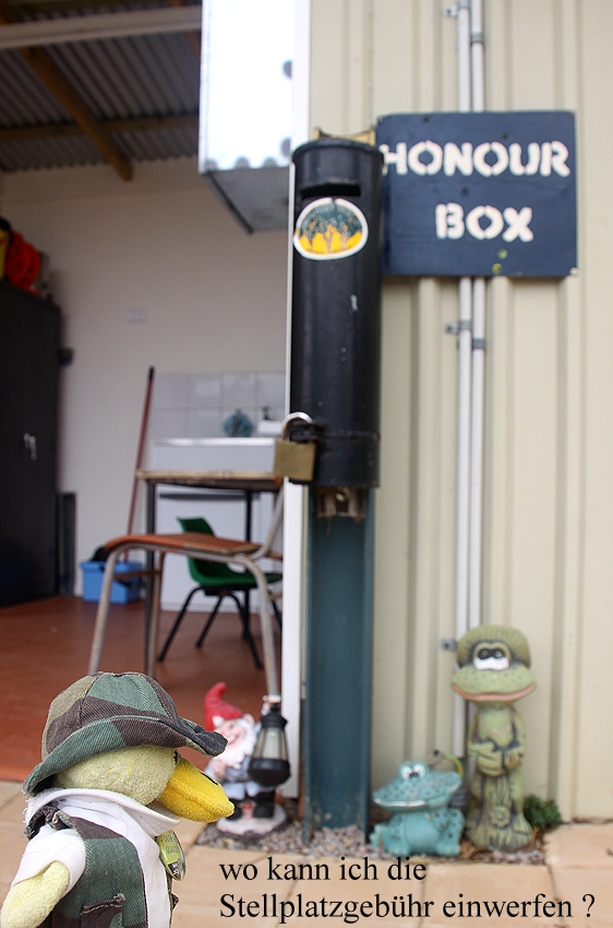 Ich wurde um 7.00 h wach und stand nach ein paar Minuten auf. Tomoko nutzte die Gelegenheit, machte sich ganz breit im Bett und schlief noch weiter. Ich machte inzwischen im Schlafanzug einen kleinen Spaziergang in die nähere Umgebung. Dabei konnte ich zahlreiche Vögel beobachten, Wattlebirds, Ringnecks, Magpies und Honeyeater. Als ich nach einer halben Stunde zum Auto zurückkam, schlief Tomoko immer noch. Mein Hinweis auf anwesende Vögel machte sie aber sofort hellwach, so dass sie auch aufstand. Das Frühstück war wieder lecker, aber die große Anzahl an Fliegen, die mit frühstücken wollten, störte jedoch gewaltig, so dass wir wieder unsere Fliegen-Abwehr-Netze über den Kopf streiften. So war es besser. Der Himmel war mit einer dichten grauen Wolkenschicht bedeckt, aber es regnete Gott sei Dank nicht. Auch die Temperatur war mit 21° nicht allzu hoch und da auch noch ein heftiger Wind blies, zogen wir uns etwas wärmer an. Als wir aber gegen 9.30 h mit allem fertig waren und losfahren konnten, war es schon wieder wärmer geworden, so dass wir die warmen Klamotten wieder einpackten. Auch die Luftfeuchtigkeit war mit 69% angenehm hoch. Die Campingplatz-Gebühr von 15,- $ steckte ich in einen Umschlag und warf diesen in eine bereitstehende Box. |