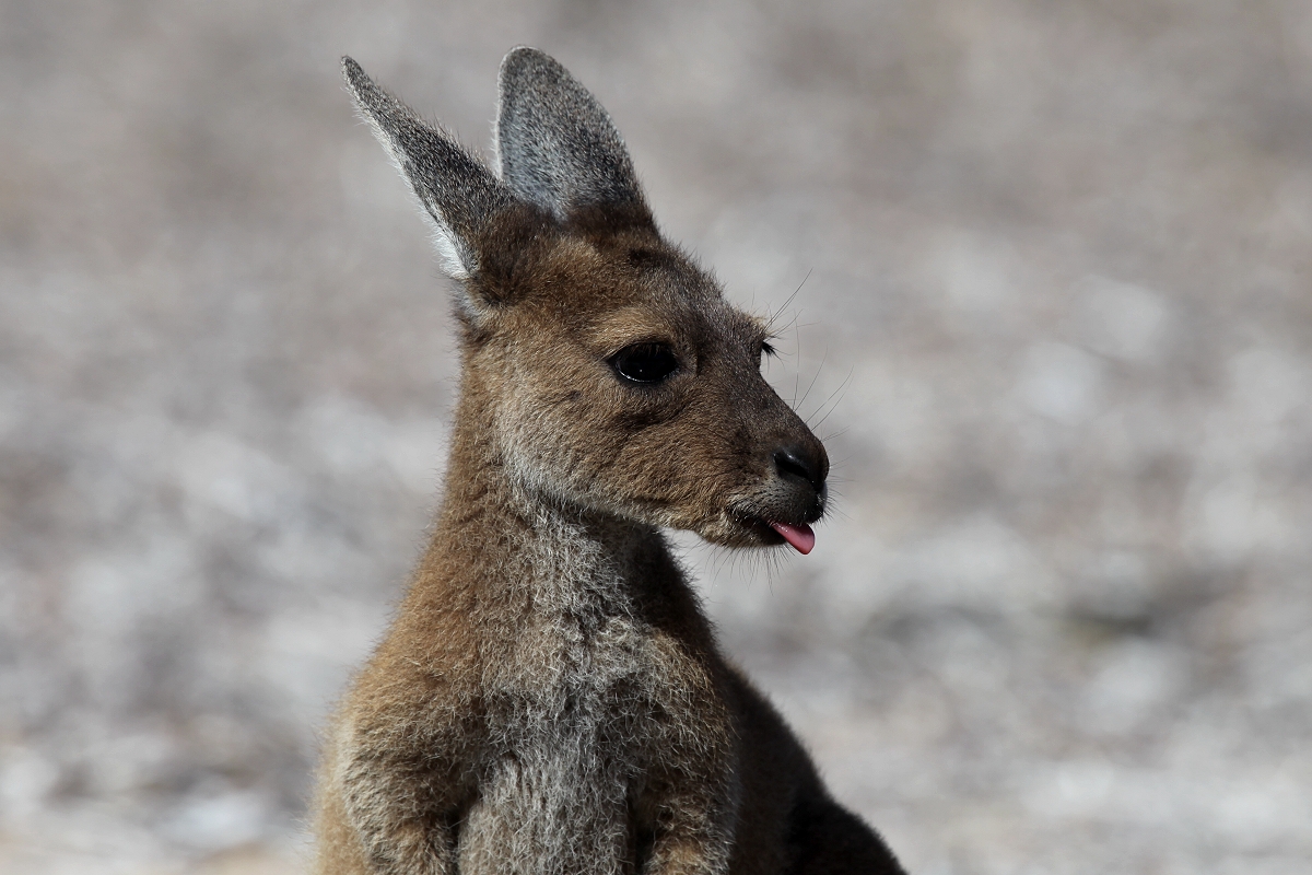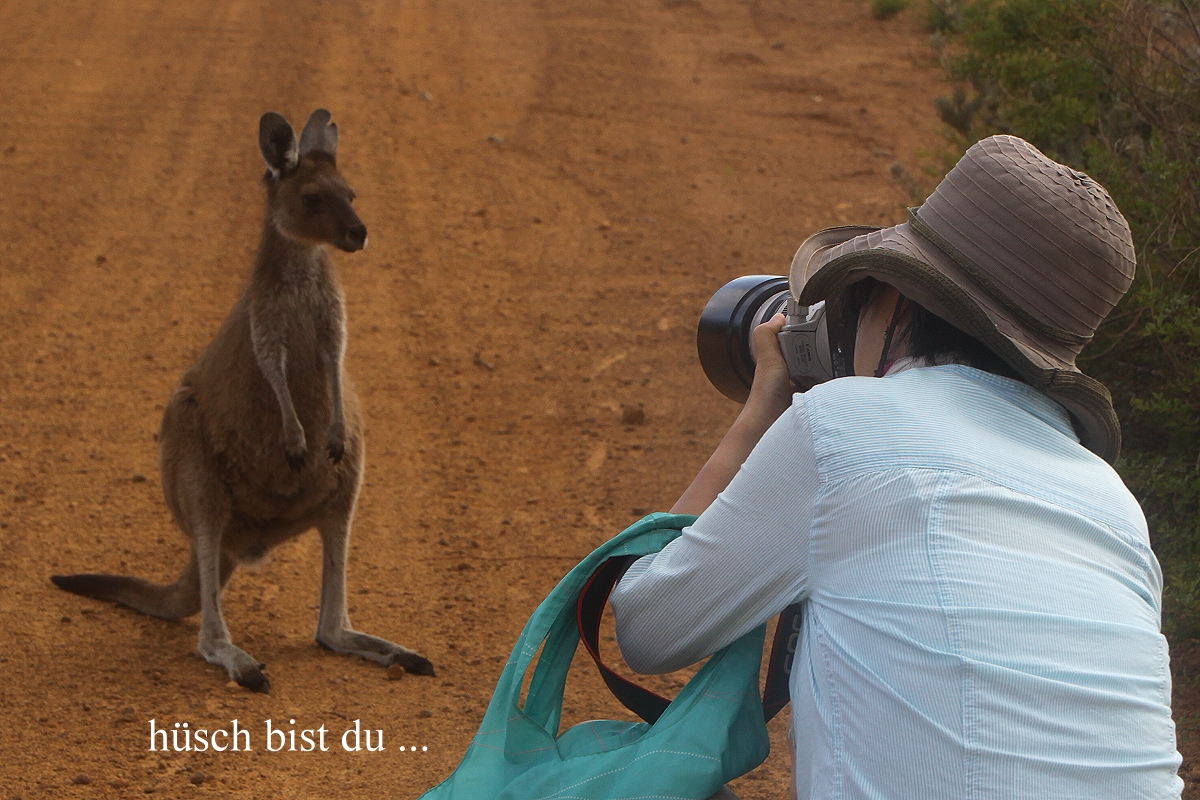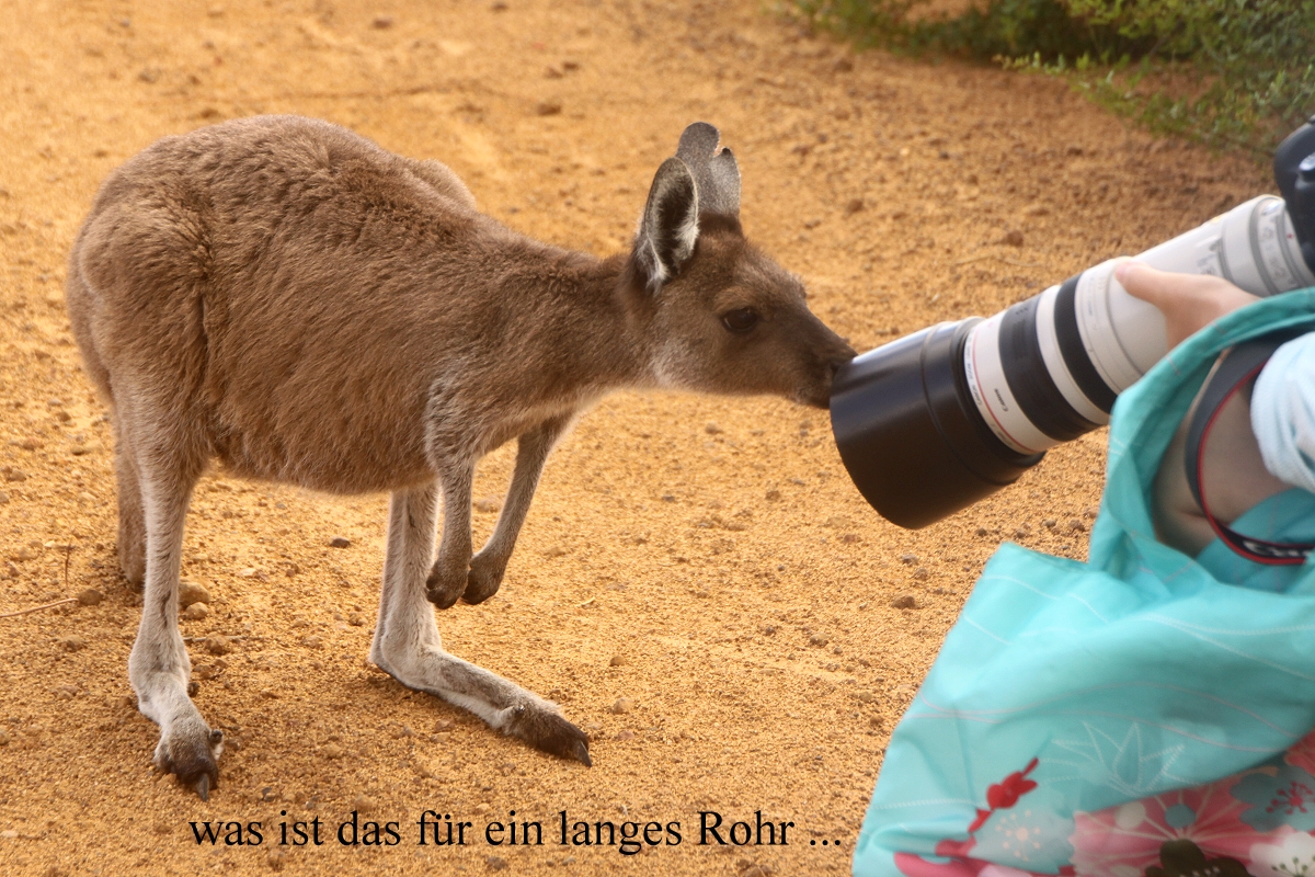 Ein junges Känguru kam neugierig näher und interessierte sich sehr für Tomokos Kamera. Auch die hier üblichen Vögel flogen schon kreuz und quer durch die Landschaft. |
