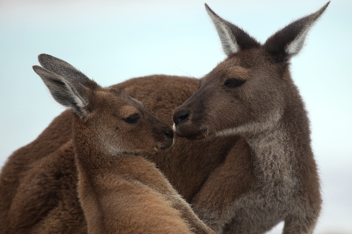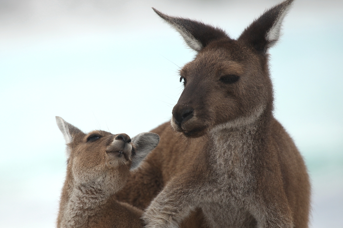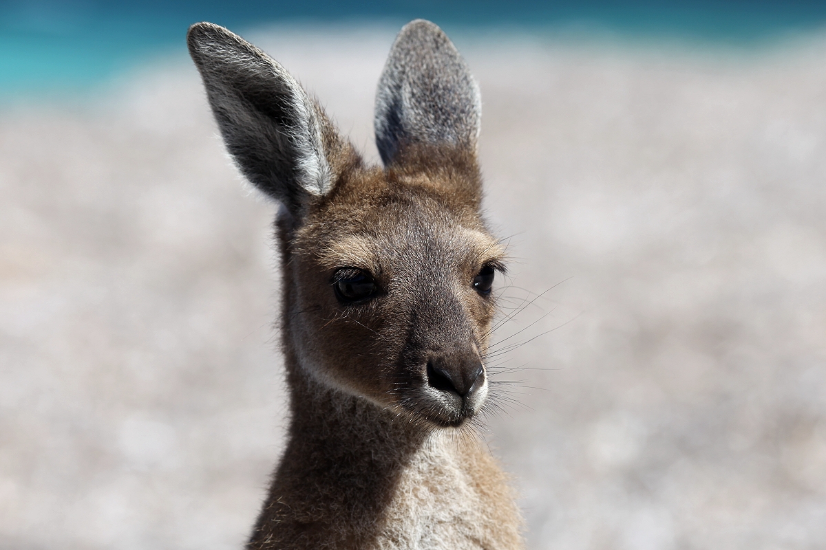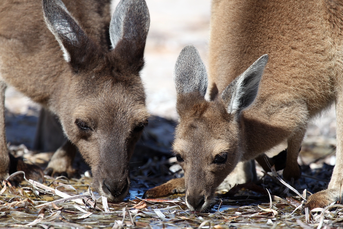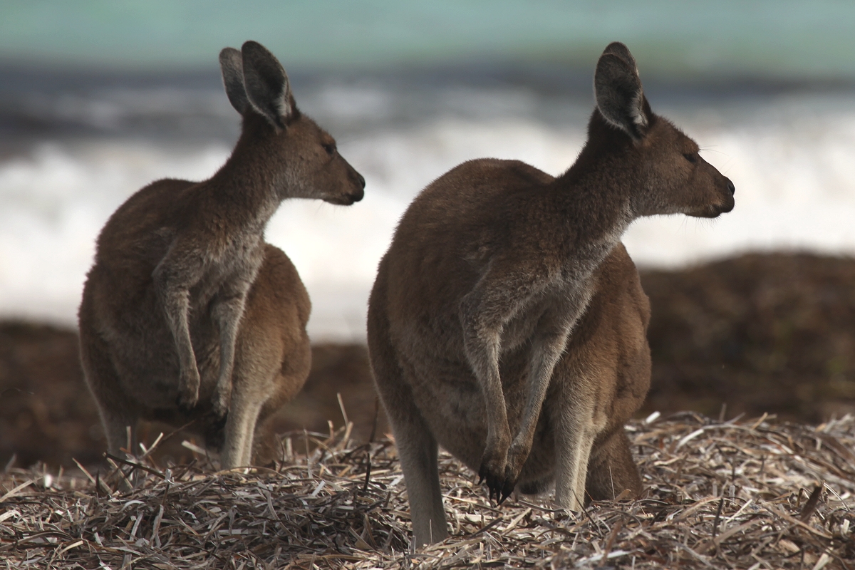 Der Wind wehte uns stürmisch entgegen, als wir zunächst über trockene Algen den schneeweißen Sand betraten. Da waren doch tatsächlich einige Kängurus auf dem Strand, die offensichtlich an den trockenen Algenblättern knabberten. |