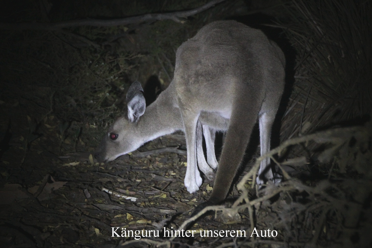 Um 5.45 h wurden wir wach. Die Sonne schien schon kräftig. Während der Nacht hatte es einige kräftige Regenschauer gegeben, aber die draußen hängenden Handtücher waren fast schon wieder trocken. Wir blieben noch ein wenig liegen, zogen uns aber dann an und machten gegen 6.25 h einen kleinen Morgenspaziergang, diesmal in die andere Richtung. Einige Kängurus waren schon unterwegs und knabberten an den saftigen Zweigen der grünen Büsche. |