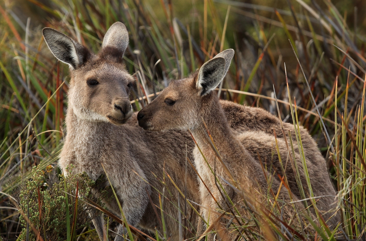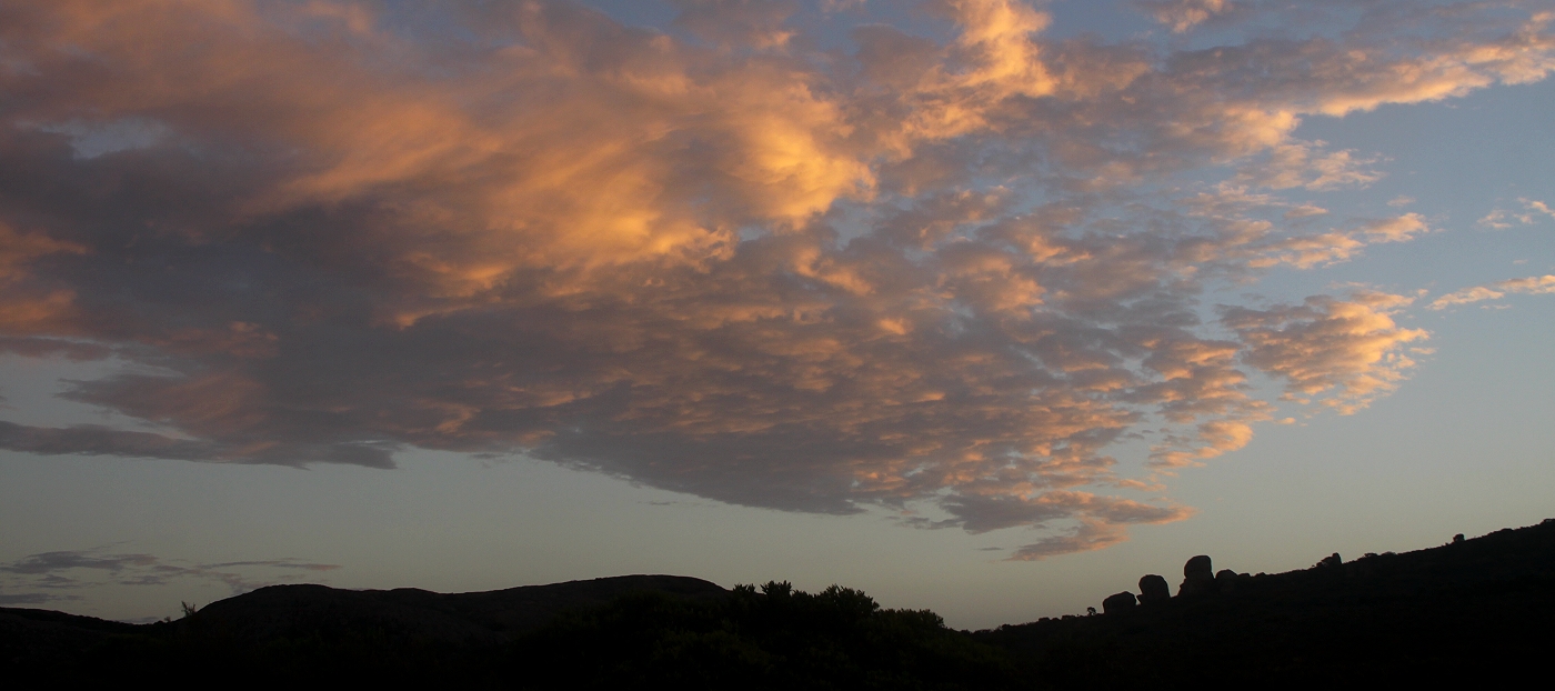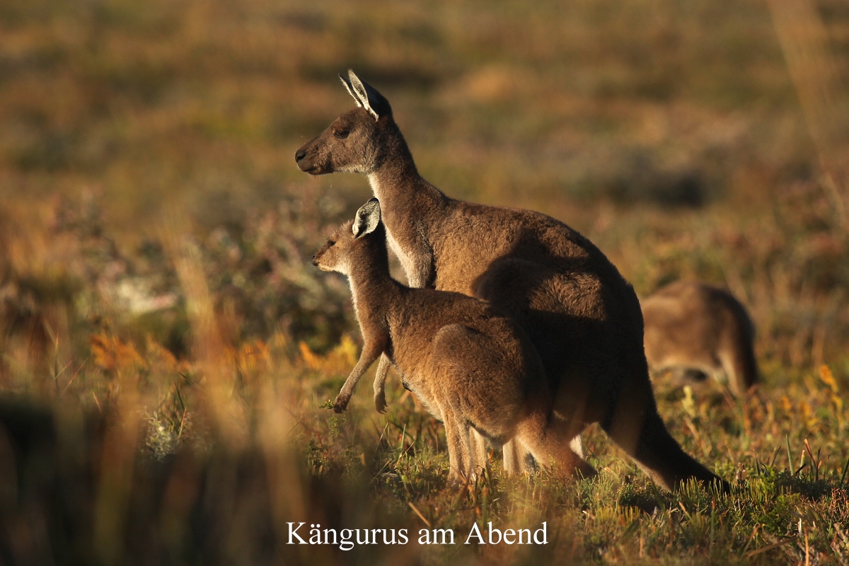 Gegen 19.00 h neigte sich die Sonne dem Horizont zu. Das Licht wurde allmählich schwächer, nur die Wolken am Himmel leuchteten noch hell. Einige Kängurus kamen uns entgegen. Die sind wirklich zutraulich, manche lassen sich sogar streicheln. Langsam gingen wir zum Auto zurück. Ein wirklich erholsamer Tag ging zu Ende. |
