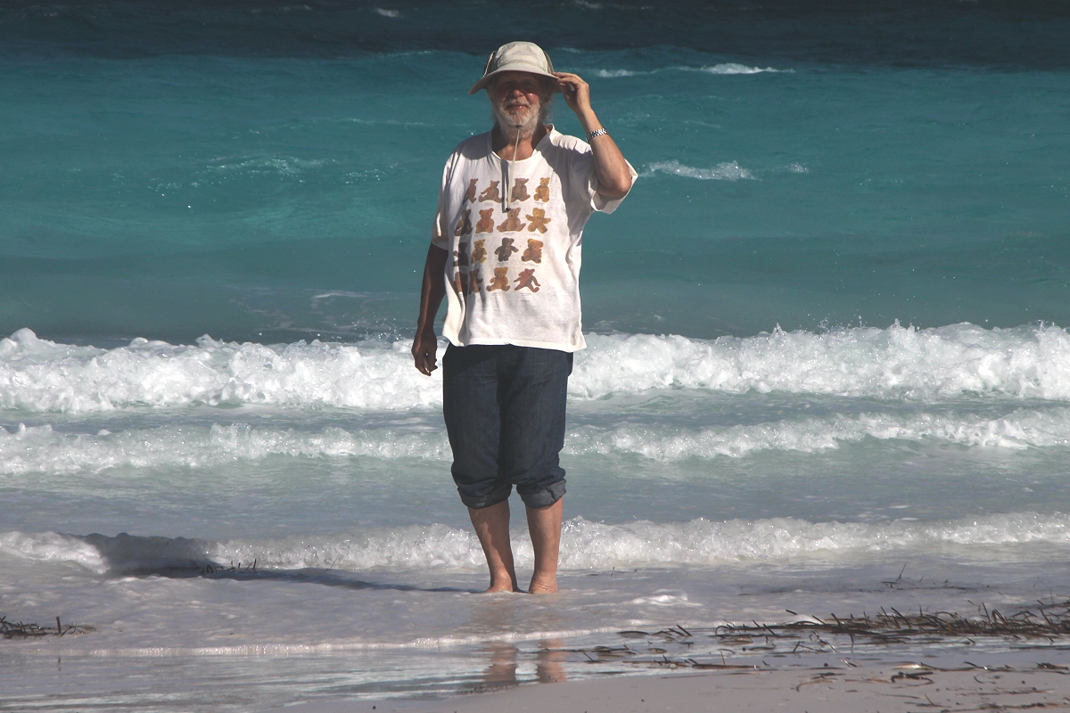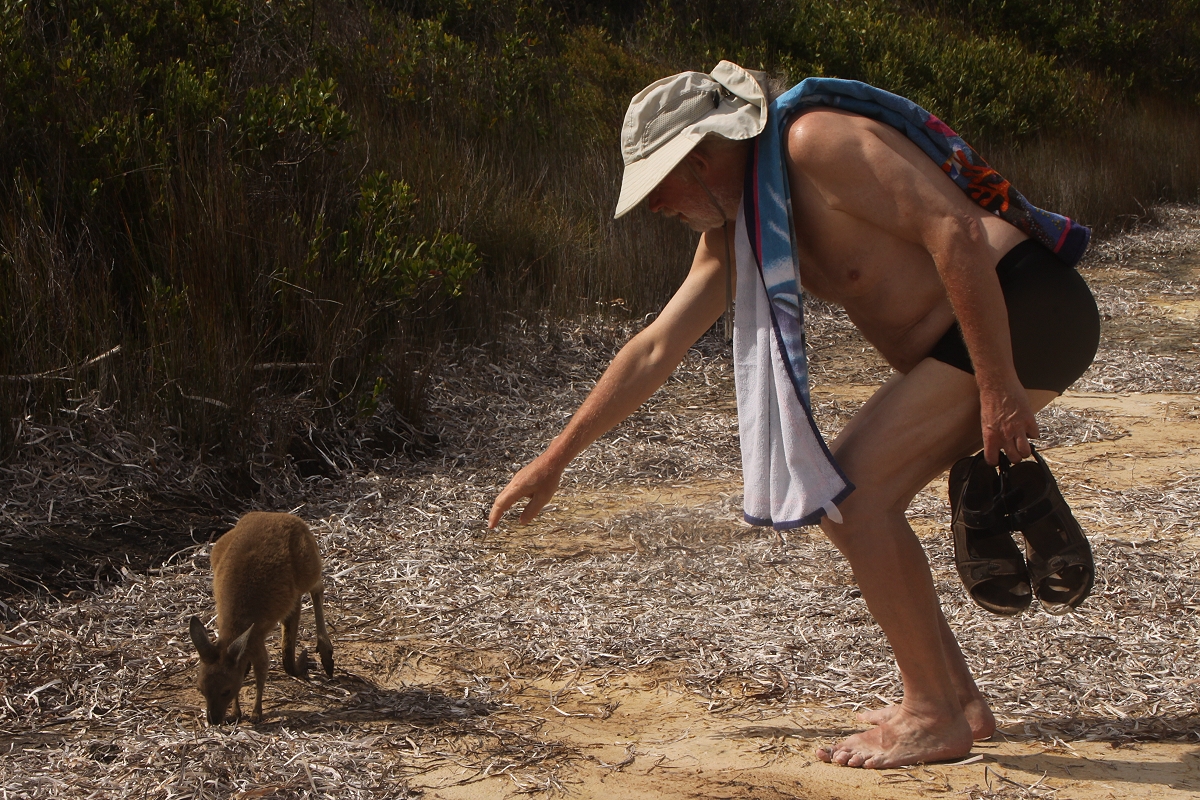 Die Sonne lockte mich aber irgendwann im Verlauf des Nachmittags an den herrlichen Strand, wo ich zum ersten Mal auf dieser Reise in das leuchtend türkisfarbene Wasser tauchte und ein wenig umherschwamm, herrlich erfrischend. Tomoko machte derweil wieder einige Fotos von den Kängurus, die mittlerweile auch am Strand eingetroffen waren. |