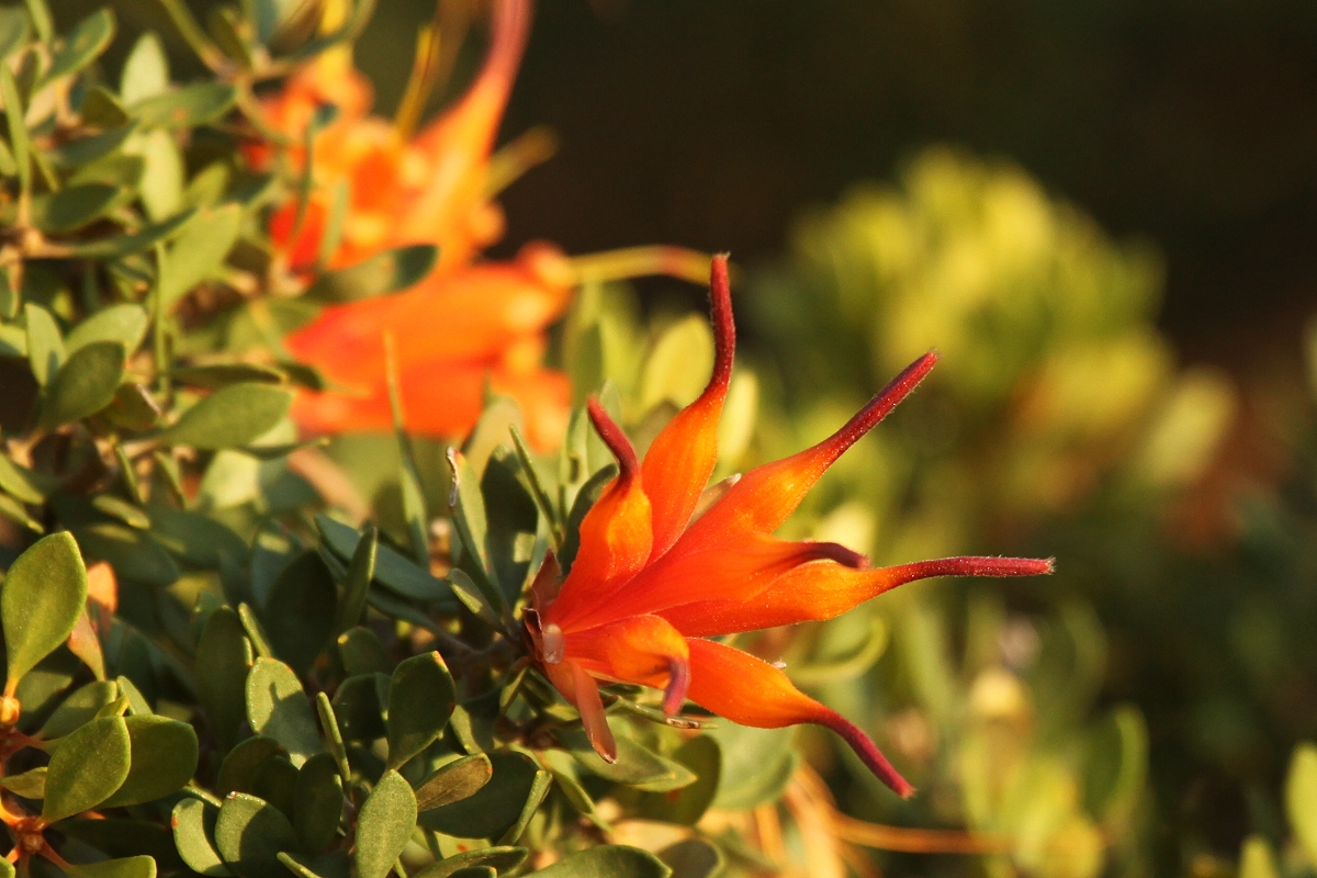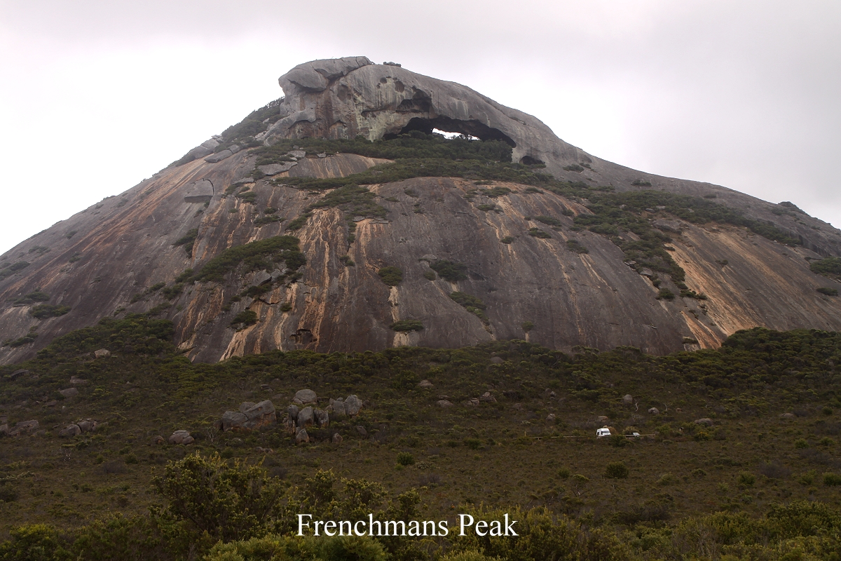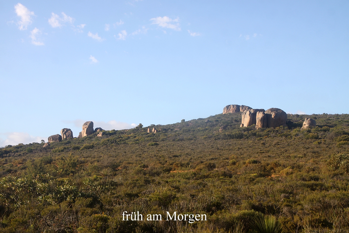 Tomoko kaufte noch ein paar Postkarten mit Malereien der Aborigines. Gegen 12.30 h fuhren wir ein Stück weiter zu einem modernen Einkaufszentrum. Während Tomoko sich bei Woolworths um frische Lebensmittel kümmerte, kaufte ich mir eine Zeitung und setzte mich damit auf eine Bank. Besonders der Wetterbericht interessierte mich, und der sah für die nächsten Tage positiv aus, kein Regen und angenehme Temperaturen um die 27°. Um 13.30 h waren wir abfahrbereit. Ich hatte inzwischen einen Prospekt studiert mit tollen Fotos von herrlichen Stränden. Dabei fiel mir Lucky Bay im LeGrand Nationalpark besonders ins Auge. Hier soll es sogar Kängurus am Strand geben. Also machten wir uns auf ca. 50 km Richtung Osten. Unterwegs um 14.10 h ein arger Schreck. Ich hatte einen Vogel gesehen, wollte zurückfahren und war beim Wenden des Autos mit der linken Seite im Sand neben der Straße steckengeblieben. Ich schaltete auf Vierradantrieb um und es gelang mir, mit teilweise durchdrehenden Rädern wieder festen Untergrund zu erreichen. Puh, das war ein Schreck… Nun ging es weiter durch die grüne Landschaft, zunächst durch Wiesen und Weideland mit Schafen und Kühen. Beim Eintritt in das Gebiet des Nationalparks änderte sich das Landschaftsbild abrupt. Dichte grüne Vegetation bedeckte wie ein Teppich die Umgebung, aus der hin und wieder Sträucher (Munji) mit leuchtend orangefarbenen Blüten auftauchten, was zum blauen Himmel einen wunderschönen Kontrast bildete. Einige felsige Hügel tauchten auf, der links von der Straße liegende heißt "Frenchmans Peak". |