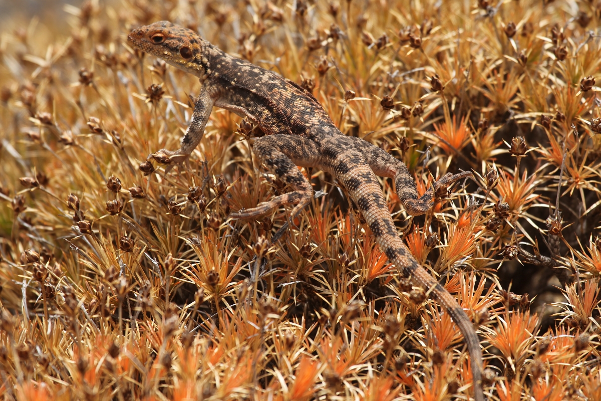 Wir wanderten weiter am Strand entlang in Richtung der Felsen. Eine Taube war kurz zu sehen. Bei den Felsen angekommen kletterten wir ein wenig hinauf und genossen die fantastische Aussicht über die Bucht. Es war etwas bewölkt, so dass die Temperatur nicht allzu hoch war, auch der Wind wehte deutlich schwächer als gestern. In einem kleinen Wasserloch, abgetrennt vom Meer, beobachteten wir zahlreiche kleine Fische, die sich immer wieder schnell unter den Steinen versteckten. Auch eine kleine Eidechse sonnte sich, dabei sprang sie mehrfach von einem dicken Stein auf den nächsten oder bewegte sich geschickt über die stachelige Vegetation hinweg. |