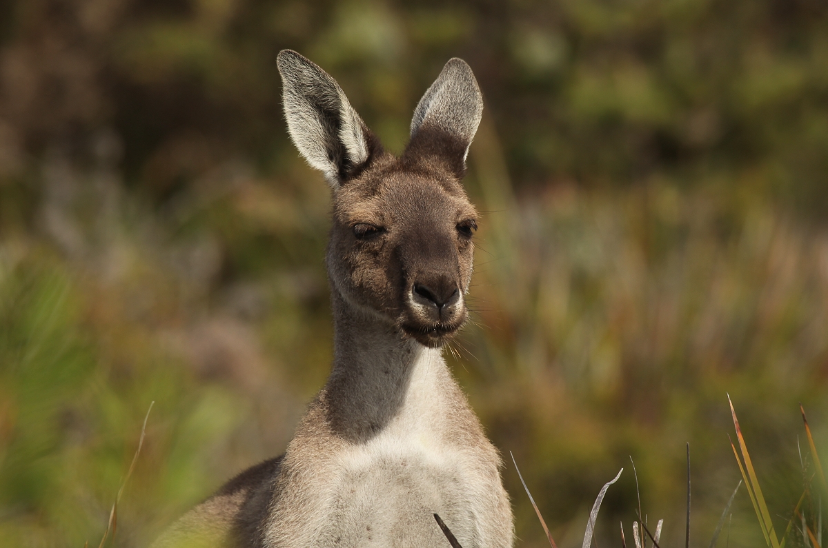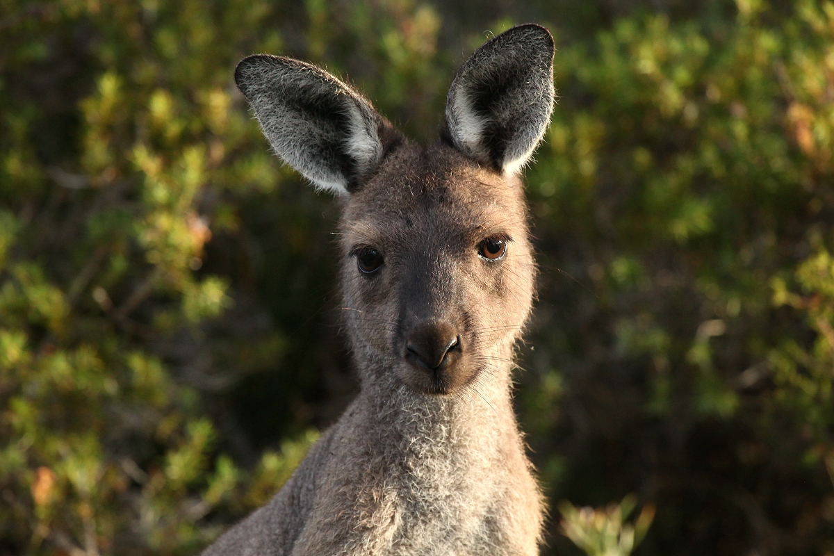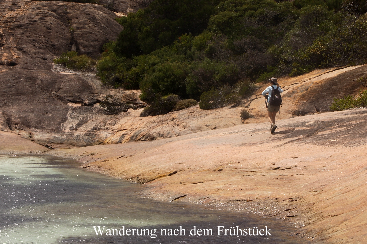 Um 5.45 h wachten wir auf. Es war schon taghell und so blieben wir auch nicht mehr allzu lange liegen. Wir beschlossen, vor dem Frühstück noch eine kleine Wanderung zu unternehmen. Da wir noch eine Nacht hierbleiben wollen, hatten wir genug Zeit, um den Tag in aller Ruhe gemütlich zu verbringen. Um 6.30 h gingen wir los auf einem Wanderweg, der zur Nachbarbucht (Thistle Cove) führte. Außer etlichen New Holland Honeyeater trafen wir auch auf eine Gruppe Kängurus, die inmitten der saftigen Büsche ihr morgendliches Frühstück einnahmen. Der Pfad ging etwas bergauf. |