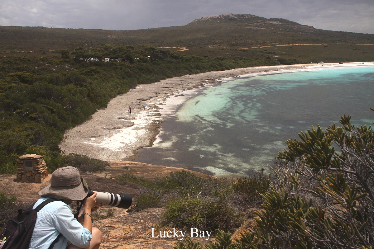 Dann nach einer Biegung endlich das Meer. Ein herrlicher Blick tat sich auf eine Bucht (Thistle Cove) auf, in der das Wasser in herrlichen Farben von hellem türkis bis dunkelblau leuchtete, ein traumhafter Anblick… Der Sand war schneeweiß. Nur 2 km weiter dann unser Ziel, Lucky Bay, ebenfalls ein unglaublich schöner Strand mit unwirklichen Wasserfarben. Sogar die keinen Strand liebende Tomoko war begeistert. Man sagt, dass dieser Strand zu den schönsten in der ganzen Welt gehört. Das kann ich nur bestätigen. Nachdem wir die ersten Fotos von der Anhöhe gemacht hatten, fuhren wir die kurze Strecke hinunter zum Caravan Park. Der war nicht sehr groß, aber sehr stark frequentiert. Wir fanden aber noch ein schattiges Plätzchen, nachdem uns ein Park Ranger beraten hatte. Wir hielten uns nicht lange auf, nahmen unsere Fotoapparate in die Hand und wanderten einige Stufen hinunter durch dichtes Gebüsch zum nahen Strand. |