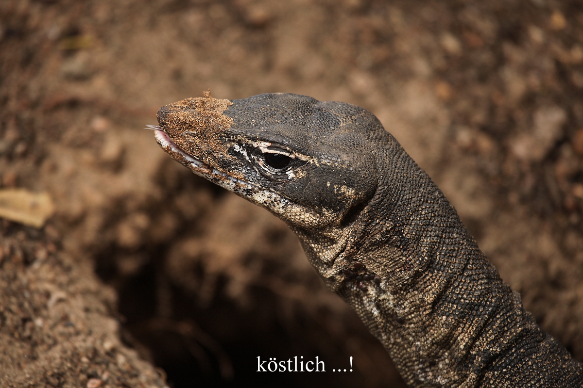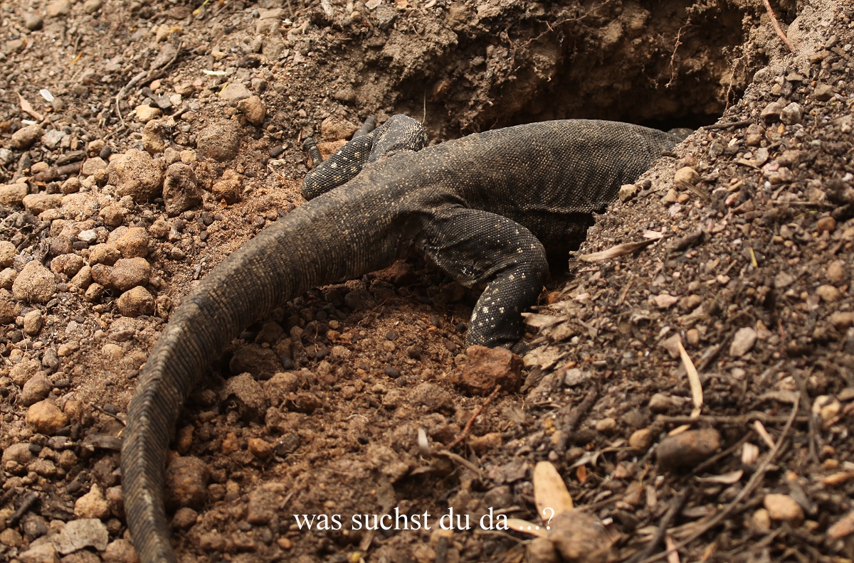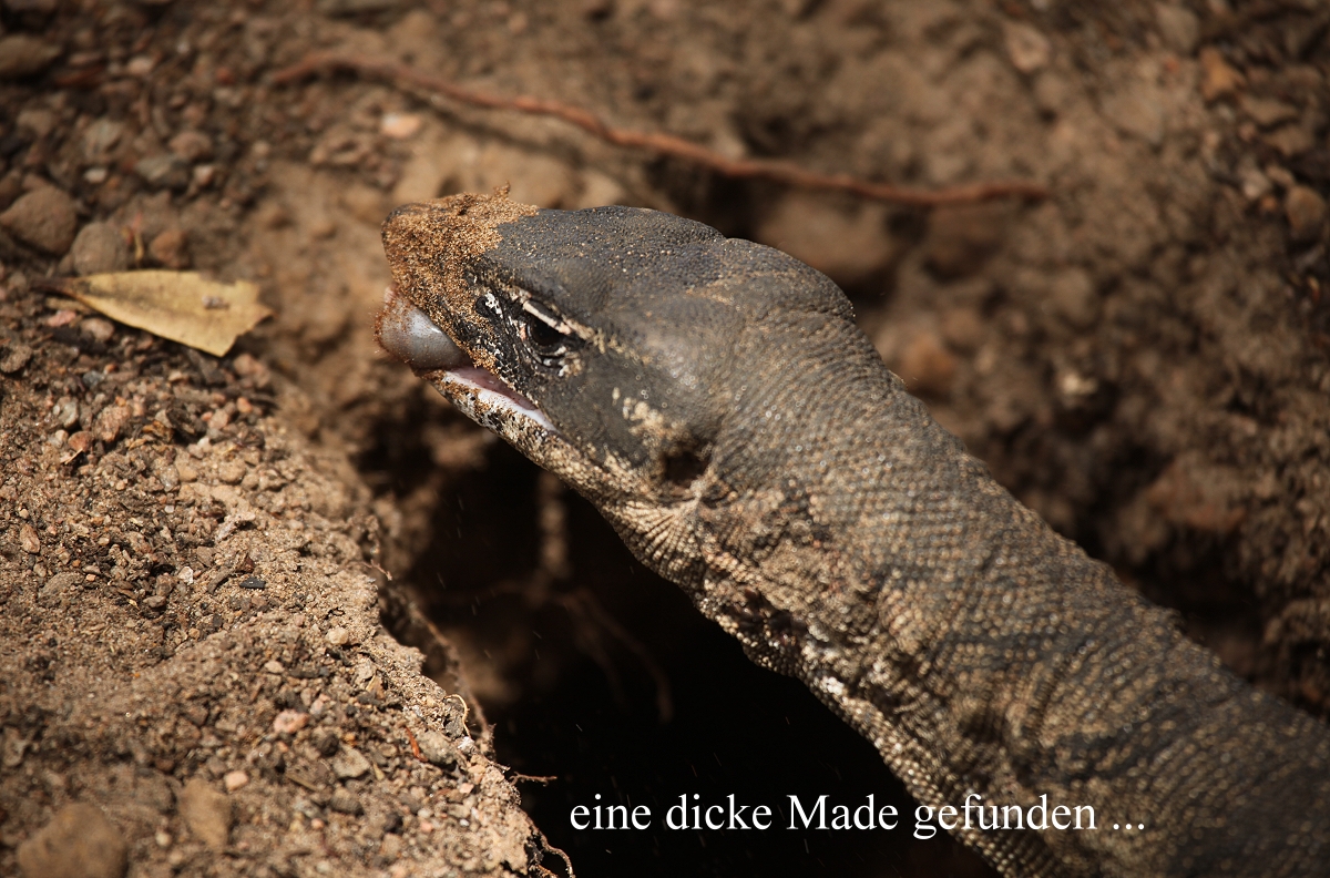 Da wir keinen Strom hatten und kein Toastbrot rösten konnten, schmierte Tomoko mir ein dickes herzhaftes Sandwich mit Kartoffelsalat, Gurken, Käse und Mayonnaise, sehr lecker. Auch der heiße Kaffee tat gut. Kurz nach 10.00 h machte ich einen kleinen Gang zum Strand. Auf dem Weg dorthin war ein Waran dabei, ein dickes Loch in den Boden zu graben. Am Strand selbst war nichts zu sehen außer den beiden großen Möwen (Pacific Gull), die wir schon gestern angetroffen hatten. Als ich zurückkam, war Tomoko dabei auf ihrem Laptop zu schreiben. Sie konnte jedoch in der hellen Umgebung kaum etwas erkennen, so dass sie damit aufhörte. Stattdessen gingen wir um 10.20 h wieder los mit unseren Kameras. Der Waran hatte inzwischen fleißig weitergegraben. Wir schauten eine Weile zu, da kam er plötzlich aus der Höhle heraus mit einer dicken fetten Made im Maul, die er genüsslich verspeiste, hmmm…. Das machte er gleich noch mal. |