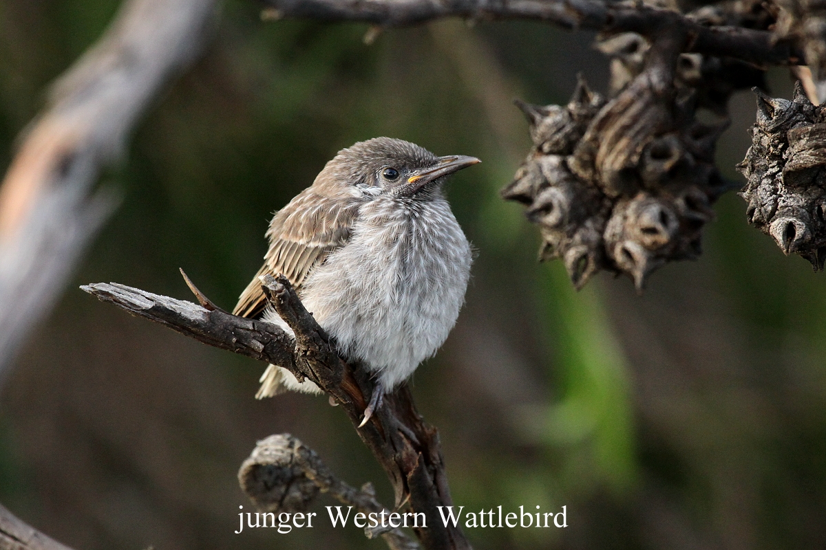 Gegen 16.30 h gingen wir zurück. Ich nahm gleich eine Dusche und spülte das Salzwasser ab. Tomoko machte das Essen fertig. Neben dem Rest des gestrigen Ratatouilles gab es noch einen leckeren Ruccola-Salat mit Tomaten, Fetakäse und Oliven. Dazu endlich auch ein Bier, lecker… Während wir aßen, hatten sich die Wolken verdichtet und begleitet von einigen Donnerschlägen, regnete es ein wenig. Das dauerte jedoch nicht länger als eine halbe Stunde, dann klarte der Himmel wieder auf. Ich spülte noch schnell das schmutzige Geschirr und folgte dann Tomoko, die mit ihrer Kamera schon vorangegangen war und im wunderbaren Abendlicht fleißig fotografierte (White-naped Honeyeater, Silvereye, Black-faced Cuckoo-Shrike, White-browed Scrub-Wren und die anderen schon bekannten Arten). Besonders eindrucksvoll war zu sehen, wie ein Western Wattlebird sein Junges fütterte. |