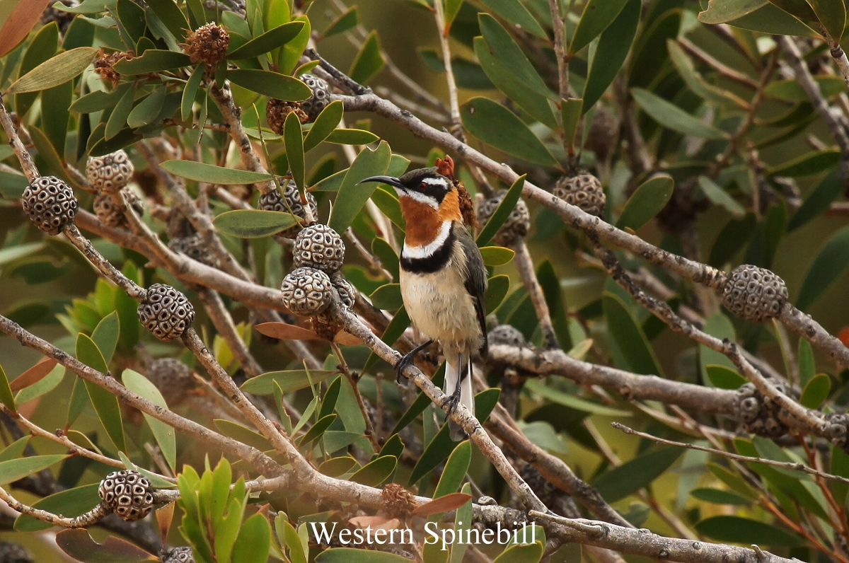 Plötzlich mitten im Gehen rutschte mir meine Hose über die Knie bis zum Boden. Habe ich tatsächlich in den letzten 2 Wochen so abgenommen…! Da muss ich mir doch wirklich gleich einen Gürtel anziehen, damit das nicht noch mal passiert. Um 7.50 h waren wir von unserem Morgenspaziergang zurück. Als wir den Campingplatz erreichten, tauchte plötzlich ein für uns neuer Vogel auf, ein sehr hübscher Western Spinebill. Wir freuten uns auf ein Frühstück. |