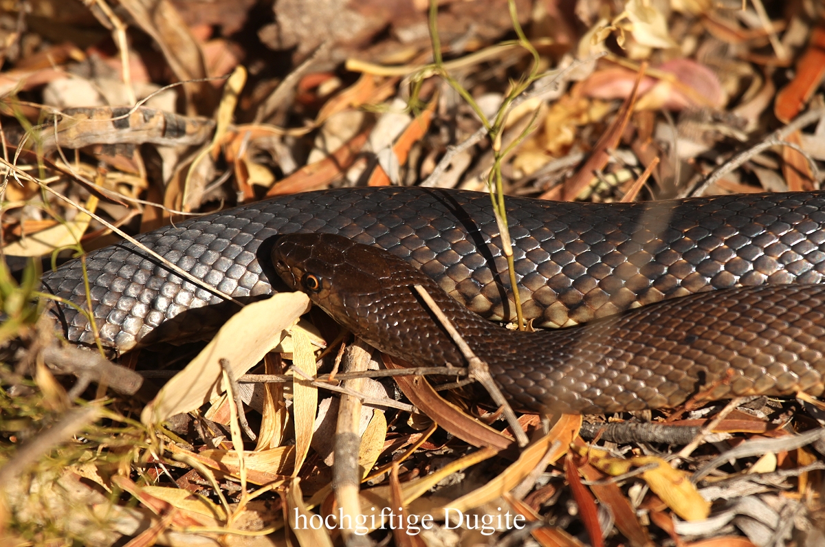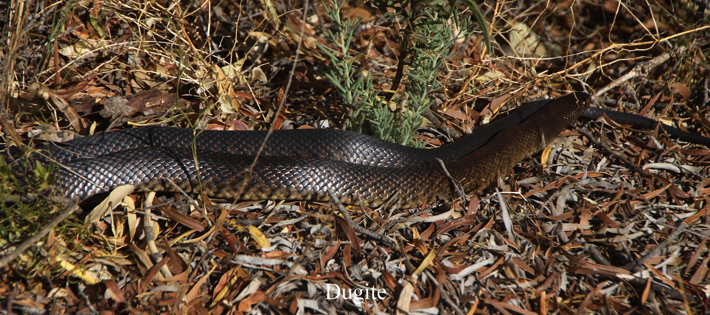 Gegen 15.30 h etwa 10 km vor unserem Ziel entdeckte Tomoko links von uns an einem kleinen Tümpel 3 Enten, Australian Shelducks. Um 15.50 h kamen wir am Ziel an. Der Cape-Arid-Nationalpark ist ein 2.798 km² großes Naturschutzgebiet im australischen Bundesstaat Western Australia. Der 1969 gegründete Nationalpark liegt am gleichnamigen Kap an der Südküste Westaustraliens, 120 km östlich der Stadt Esperance. Landschaftlich wird er gekennzeichnet durch den Übergang von der vegetationsreichen Küstenzone an der Großen Australischen Bucht zum trockenen Landesinneren. Entsprechend variiert die Flora zwischen bewaldeten und eher steppenähnlichen Regionen. Eine besondere Bedeutung hat der Cape-Arid-Nationalpark als Lebensraum von über 160 Vogelarten. (Quelle Wikipedia). Direkt am Thomas River fanden wir einen schönen Stellplatz (Nr.7). Jeder Platz liegt separat im grünen Busch mit eigener Sitzbank. Die Toilette ist gleich gegenüber und fließendes Wasser zum Kochen ist auch vorhanden. Wir machten es uns erst einmal gemütlich und inspizierten die nähere Umgebung. Der Wind war ziemlich kühl und ließ Tomoko ein wenig frösteln. Also gingen wir wieder zum Auto zurück. Tomoko wollte sich mit warmem Wasser waschen. Ich wollte gerade zur gegenüberliegenden Wasserstelle gehen, als ich vor mir auf dem Weg eine etwa 1,20 m lange schwarzbraune Schlange sah. Schnell ging ich zurück und holte die Kamera. Nachdem ich ein paar Fotos gemacht hatte und etwa 2m herangekommen war, verschwand die Schlange blitzschnell im Gebüsch. |