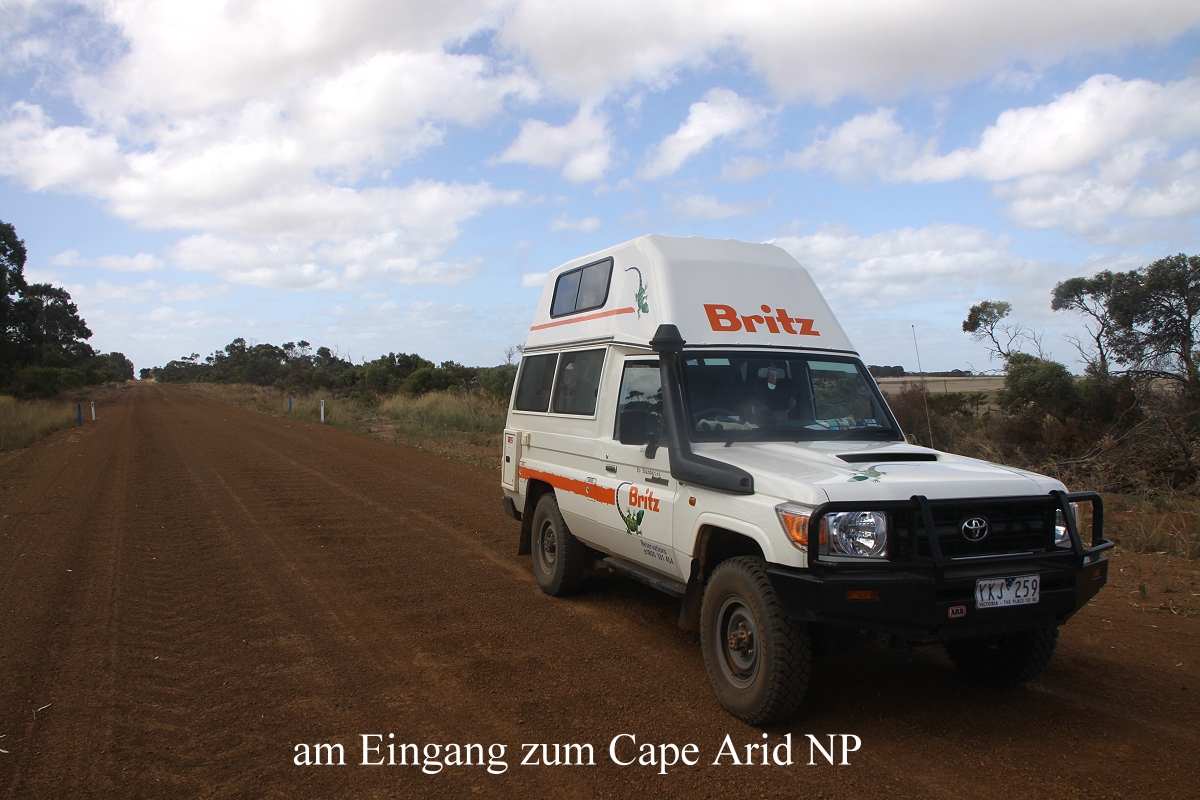 Das Wetter war inzwischen wieder schön sonnig, aber nicht zu heiß. Um 14.00 h waren wir dann soweit und fuhren in östlicher Richtung die gut 120 km bis zum Cape Arid NP. Unterwegs zeigte uns eine große Tafel am Straßenrand an, dass alle Straßen und Pisten im Park offen waren. |