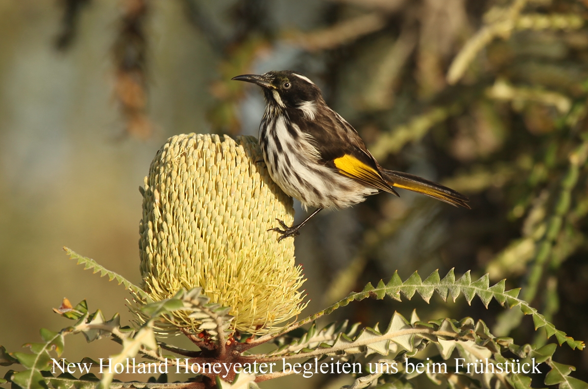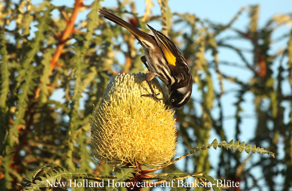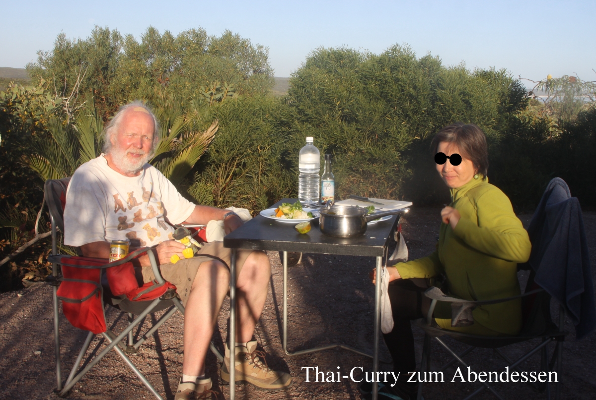 Jetzt wurde es so langsam Zeit fürs Abendessen. Diesmal gab es ein schmackhaftes Thai-Curry. Tomoko war es zu scharf, doch ich fand es gerade richtig. Dazu schmeckte ein kühles Bier wunderbar. Auf den Banksia-Blüten um uns herum suchtem einige New Holland Honeyeaters intensiv nach Futter. |
