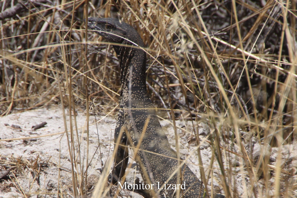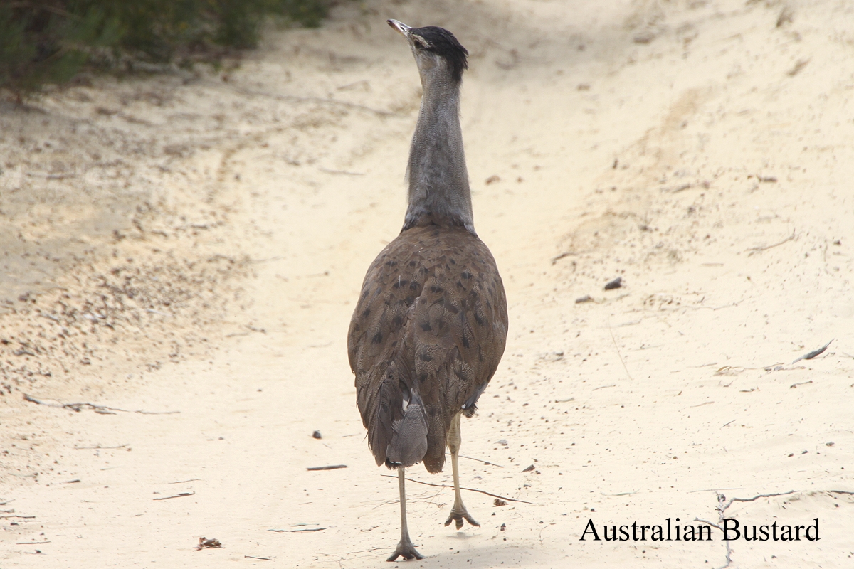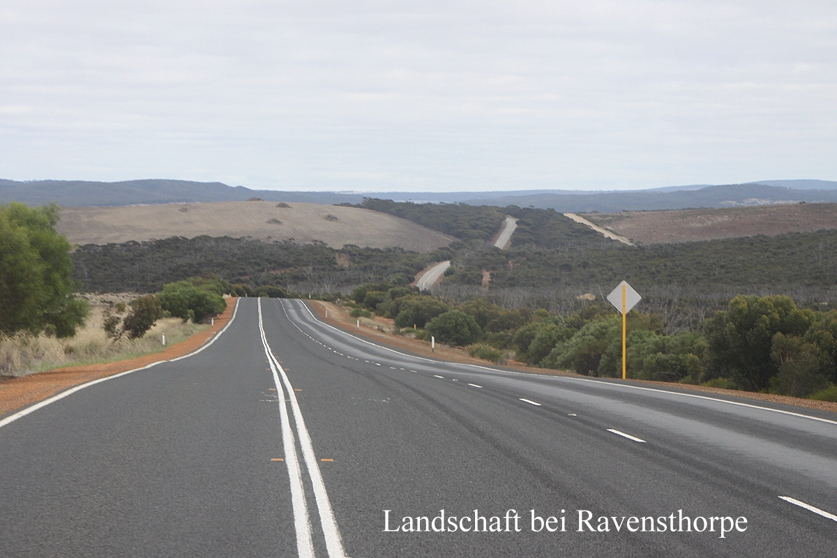 Da wir unsere geplante Wanderung nicht machen konnten, fuhren wir über eine raue Schotterpiste in Richtung Poison Creek Road. Nach 34 km ging diese in eine Sandpiste über mit extrem tiefen Spurrillen, die nur noch mit Vierradantrieb zu bewältigen war. Das hatten wir zwar, doch die Bodenfreiheit unseres Autos schien mir nicht hoch genug, um uns auf diese Strecke zu wagen. Deshalb fuhren wir nicht weiter, sondern ließen das Auto stehen und machten ein paar Schritte zu Fuß. Ich ging etwas voraus und plötzlich wie aus dem Nichts tauchte 5 m von mir entfernt eine Trappe (Australian Bustard) auf, die ganz gemütlich weiter auf der Sandpiste voranschritt. Die Büsche rechts und links waren so dicht, dass sich kein Lüftchen regte. Dadurch wurde es durch die starke Sonneneinstrahlung sehr heiß. Etliche Vögel zwitscherten in den Sträuchern, doch sie waren sehr schwierig zu erkennen. Einen White-cheeked Honeyeater konnte Tomoko fotografieren, der dem New-Holland Honeyeater gleicht, aber doch anders aussieht. Ebenfalls Purple-gaped Honeyeater , Striated Pardalote und Western Spinebill konnten wir beobachten. Es war inzwischen 11.00 h geworden und die Hitze wurde immer größer, so dass wir beschlossen zurückzufahren. Auf dem Weg zum Auto sahen wir noch einen Waran (Monitor Lizard), der schnell den Weg überquerte und sich dann im dichten trockenen Gras versteckte. |