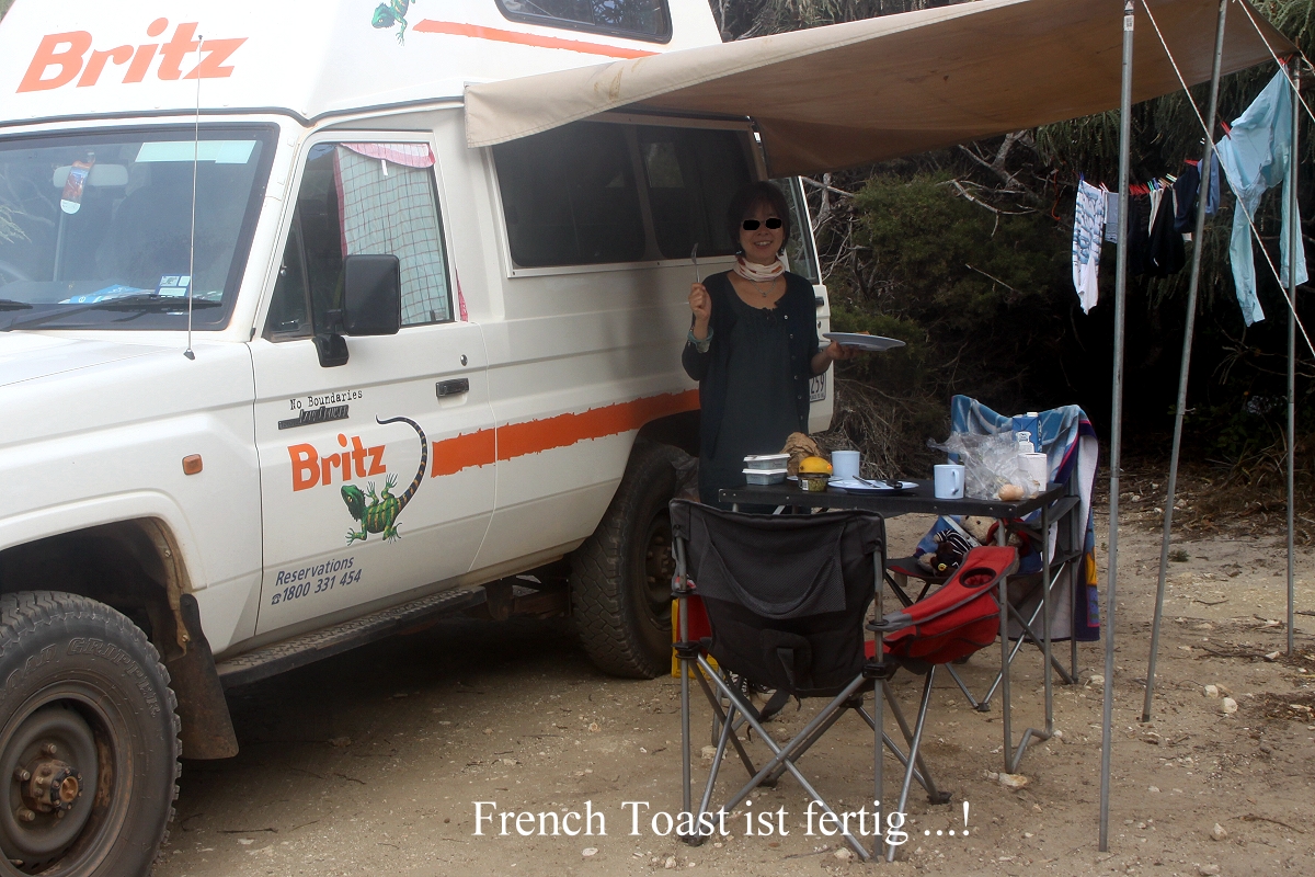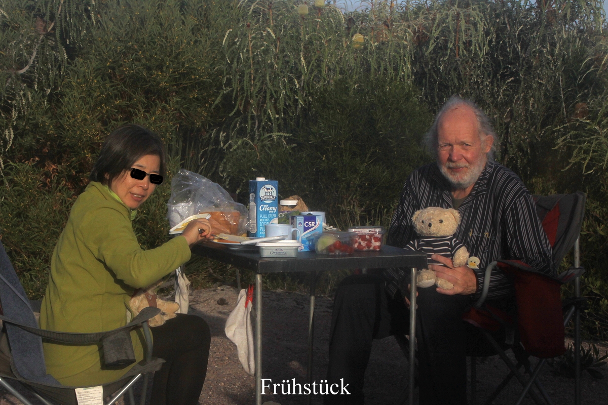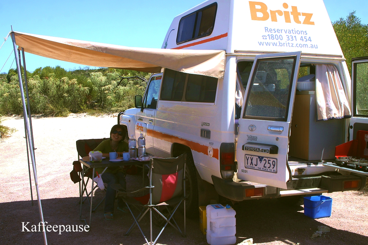 Einige km weiter bogen wir in einen kleinen Weg ab, der zum Lake Mongingup führte, eigentlich ein interessantes Vogelgebiet laut Internet, doch es war jetzt um die Mittagszeit ziemlich heiß, so dass sich kaum ein Vogel zeigte. Außerdem war das Licht nicht optimal um diese Zeit für Fotos. Wir hatten zwar Lust auf einen Kaffee, aber es gab weit und breit keine Möglichkeit und unseren Gaskocher aufzubauen war uns zu umständlich. Also fuhren wir weiter. Tomoko schlief ein wenig. Plötzlich sah ich gegen 13.30 h nach ca. 50 km ein ganz kleines Straßenschild an der Abzweigung einer Schotterstraße "Quagi Beach". Das war wirklich ein Zufall, dass ich das im Vorbeifahren gesehen hatte. Von hier aus ging es noch gut 10 km auf sehr holpriger Piste Richtung Strand. Ein kleiner Campingplatz liegt hier versteckt in den Dünen. Wir bekamen den letzten freien Platz, gut abgeschirmt von den anderen Plätzen, aber ein bisschen schmutzig. Ich baute gleich mal das Sonnendach auf und im Schatten konnten wir dann endlich gemütlich unseren Kaffee trinken. Zum Kuchen gab es diesmal überraschend auch Sahne, die Tomoko in Esperance gekauft hatte. Anschließend wusch sich Tomoko in der prallen Sonne ihre Haare. |