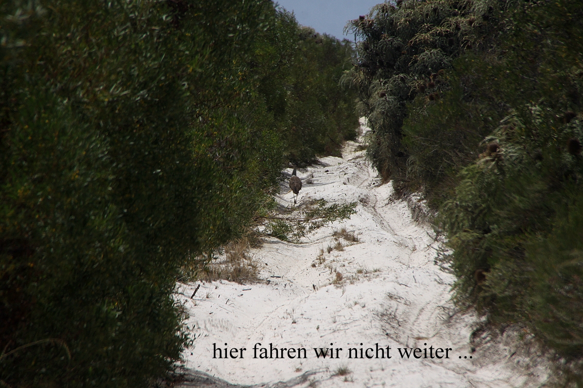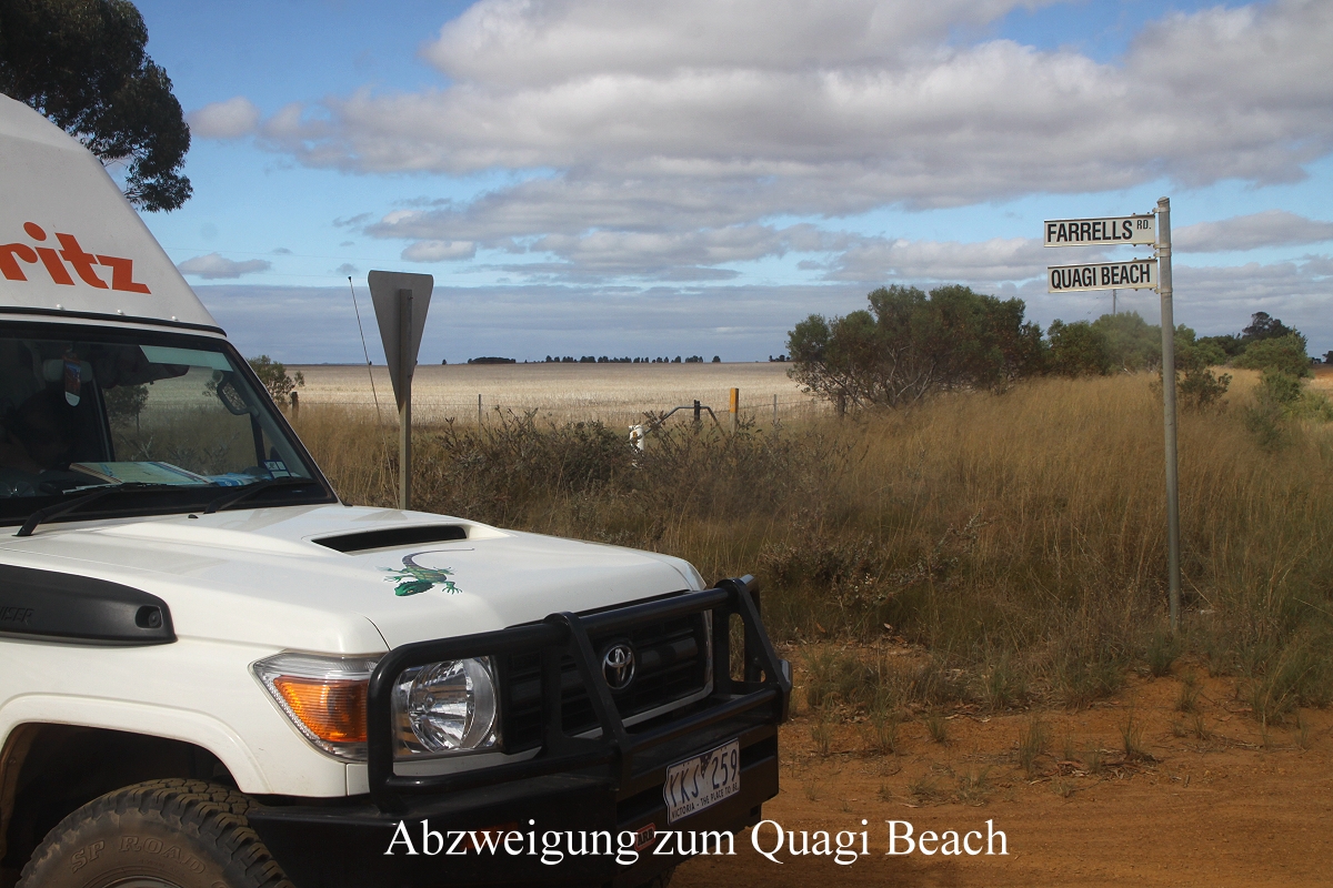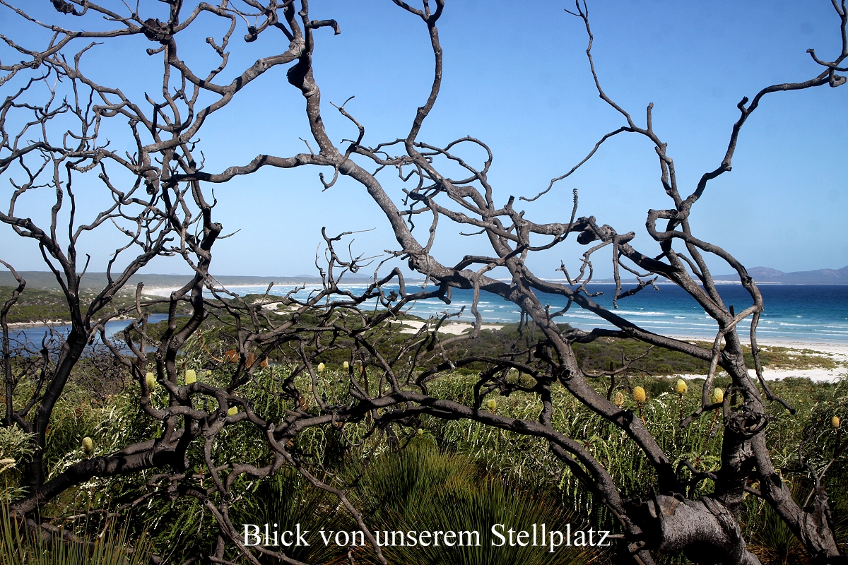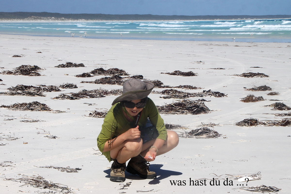 Einige km weiter bogen wir in einen kleinen Weg ab, der zum Lake Mongingup führte, eigentlich ein interessantes Vogelgebiet laut Internet, doch es war jetzt um die Mittagszeit ziemlich heiß, so dass sich kaum ein Vogel zeigte. Außerdem war das Licht nicht optimal um diese Zeit für Fotos. Wir hatten zwar Lust auf einen Kaffee, aber es gab weit und breit keine Möglichkeit und unseren Gaskocher aufzubauen war uns zu umständlich. Also fuhren wir weiter. Tomoko schlief ein wenig. Plötzlich sah ich gegen 13.30 h nach ca. 50 km ein ganz kleines Straßenschild an der Abzweigung einer Schotterstraße "Quagi Beach". Das war wirklich ein Zufall, dass ich das im Vorbeifahren gesehen hatte. Von hier aus ging es noch gut 10 km auf sehr holpriger Piste Richtung Strand. Ein kleiner Campingplatz liegt hier versteckt in den Dünen. Wir bekamen den letzten freien Platz, gut abgeschirmt von den anderen Plätzen, aber ein bisschen schmutzig. Ich baute gleich mal das Sonnendach auf und im Schatten konnten wir dann endlich gemütlich unseren Kaffee trinken. Zum Kuchen gab es diesmal überraschend auch Sahne, die Tomoko in Esperance gekauft hatte. Anschließend wusch sich Tomoko in der prallen Sonne ihre Haare. |