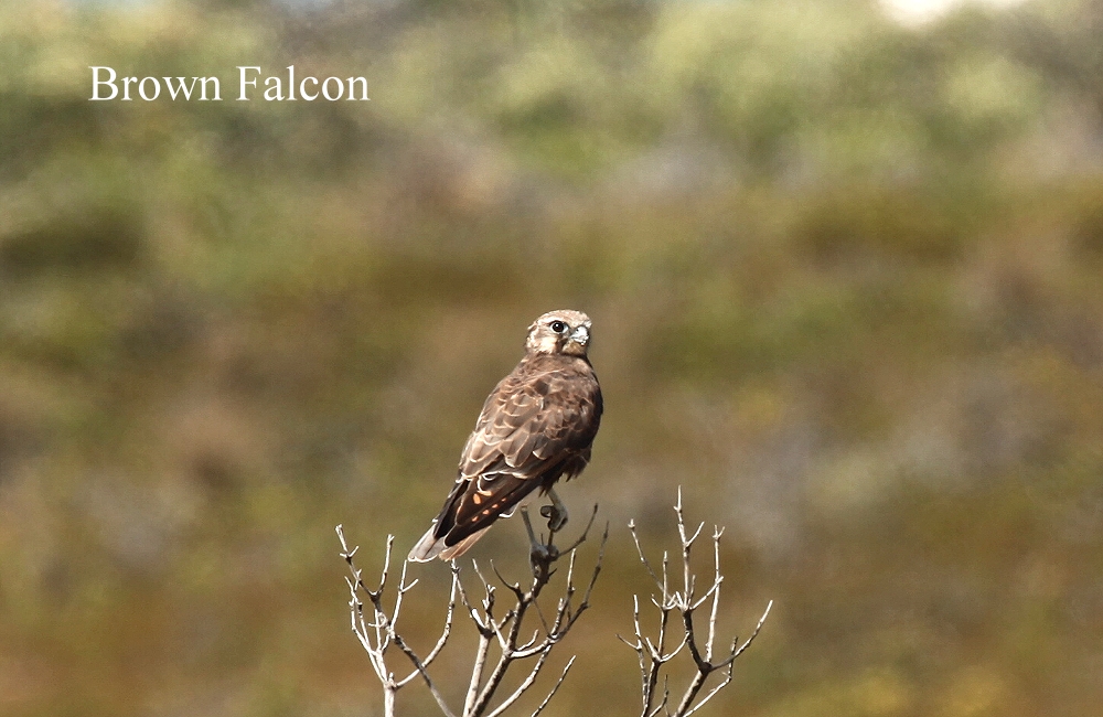 Das Wetter ist schön, doch die Luft ist noch ziemlich kühl, nur 17°. Um 8.00 h fuhren wir los um uns die nähere Umgebung anzuschauen. Auf dem benachbarten Campingplatz, ca. 2 km entfernt, fanden wir auf einer Anhöhe einen tollen Platz mit herrlicher Aussicht über die gesamte Meeresbucht. Wir beschlossen, den Campingplatz zu wechseln. Während Tomoko die Stelle besetzt hielt, fuhr ich schnell zurück, packte alles, was draußen stand ins Auto und fuhr auf den neuen Platz. Hier luden wir die Campingmöbel, Wasser und Bierkiste wieder aus und fuhren los um eine kleine Wanderung zu machen. Wir fuhren einige km und kamen an einem schönen Aussichtspunkt an, doch den Anfang des gesuchten Trails fanden wir nicht. Auf dem Weg sahen wir einen großen Schwarm schwarzer Vögel, doch als wir deren Krächzen hörten, erkannten wir, dass es Raben waren, keine Papageien. Auf einem Baum neben der Piste saß ein Brown Falcon. |