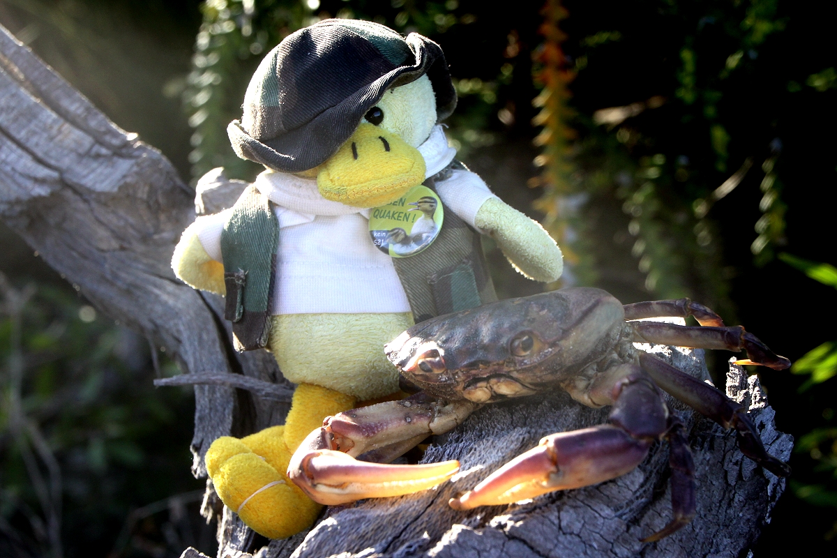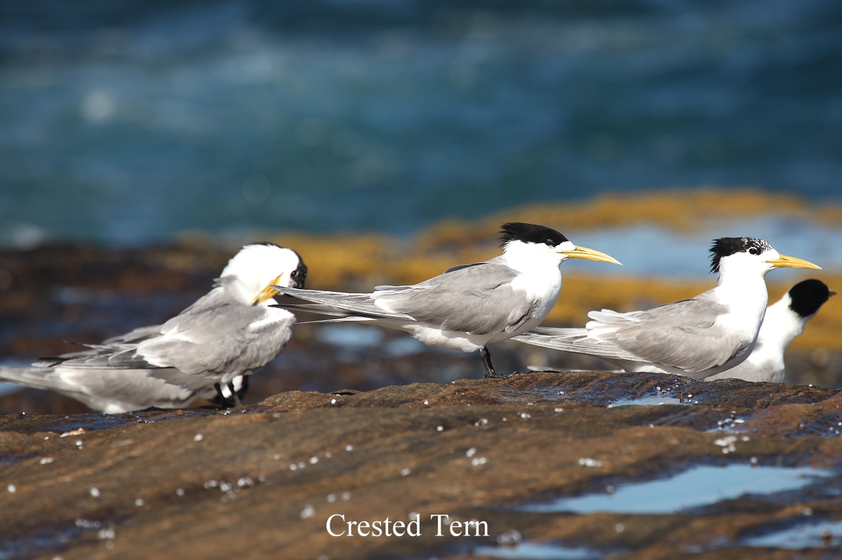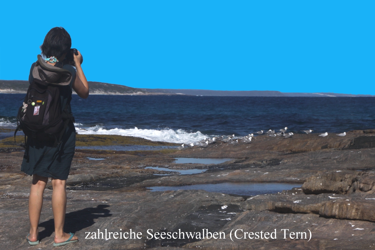 Mir fiel auf, dass wenig Menschen aber viele Hunde ohne Leine unterwegs waren, die auch ungeniert ihr Geschäft am Strand machten. Nur bei einem Besitzer sah ich, dass er die Hinterlassenschaft in einer Plastiktüte einsammelte und mitnahm, nicht sehr appetitlich. Der Quagi Beach ist in einer Werbebroschüre als der "most popular Beach" in der Umgebung von Esperance angepriesen. Vielleicht ist das damit gemeint, dass hier einige sonst selbstverständliche Regeln wie "keine Hunde ohne Leine am Strand" außer Kraft gesetzt sind oder nicht beachtet werden müssen. Immerhin ist der Campingplatz mit 5,- $ pro Nacht äußerst preiswert. Wir beobachteten die Wasservögel. Die meisten waren Seeschwalben (Crested Tern), |