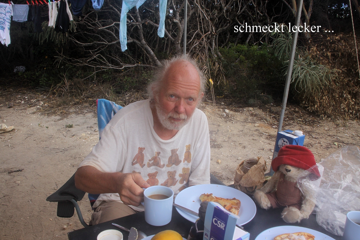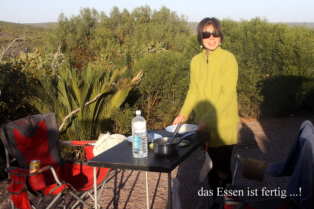 Gegen 16.15 h gingen wir langsam wieder zum Campingplatz zurück. Die Bucht lag jetzt im warmen Licht der tiefstehenden Sonne. Die Solardusche, die ich schon lange vorher mit Wasser gefüllt in die Sonne gelegt hatte, leistete jetzt gute Dienste. Das Wasser war ziemlich warm und so konnte ich das Meersalz gut von meiner Haut spülen. Auch Tomoko machte Gebrauch davon, wirklich praktisch, wenn es keine richtigen Duschen gibt. |