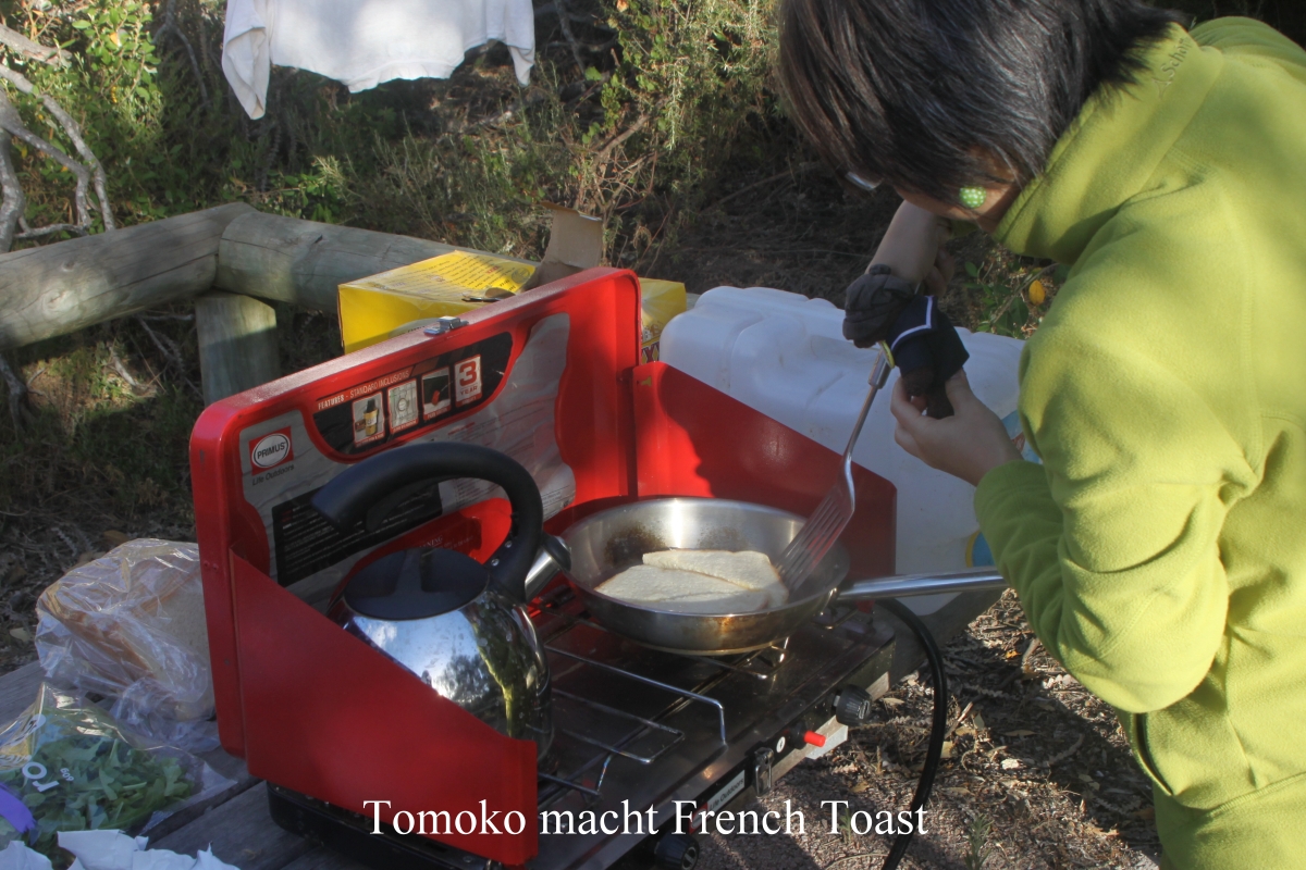 Um 5.00 h wachte ich auf, Tomoko sogar schon um 4.30 h. Es war zwar schon hell, aber der Himmel war sehr grau. Heute ist Tomokos Geburtstag. Es gab wieder ein leckeres Frühstück mit Sandwich, French Toast und Mango, hmmm… |
