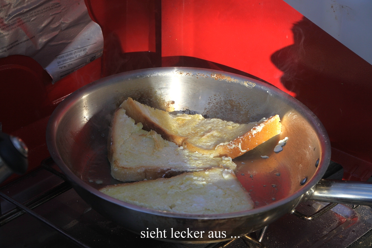 Ich schlief noch bis 6.00 h und wurde gerade wach, als Tomoko zurückkam. Wir machten uns diesmal ein opulentes Frühstück mit Sandwich, French Toast und einer köstlich schmeckenden Mango. |