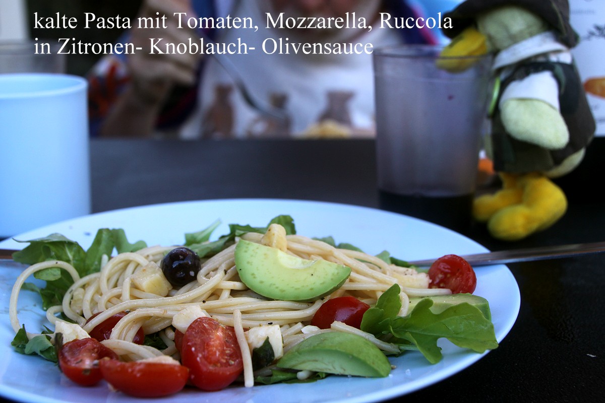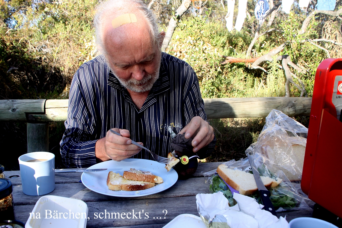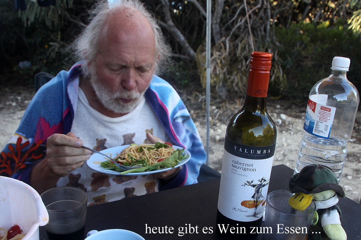 Nach einer guten Stunde kehrten wir zurück. Tomoko fing gleich an zu kochen. Ich duschte derweil unter der Solardusche, die ich vorhin installiert hatte. Heute gab es kalte Pasta mit Tomaten, Mozzarella, Ruccola in Zitronen-, Knoblauch- Olivensauce, sehr lecker. Dazu tranken wir erstmalig auf unserer Reise einen Rotwein Cabernet Sauvignon aus Südaustralien. |