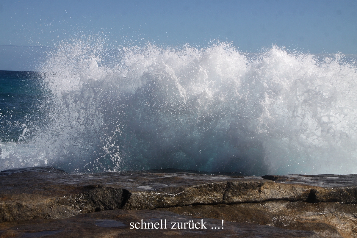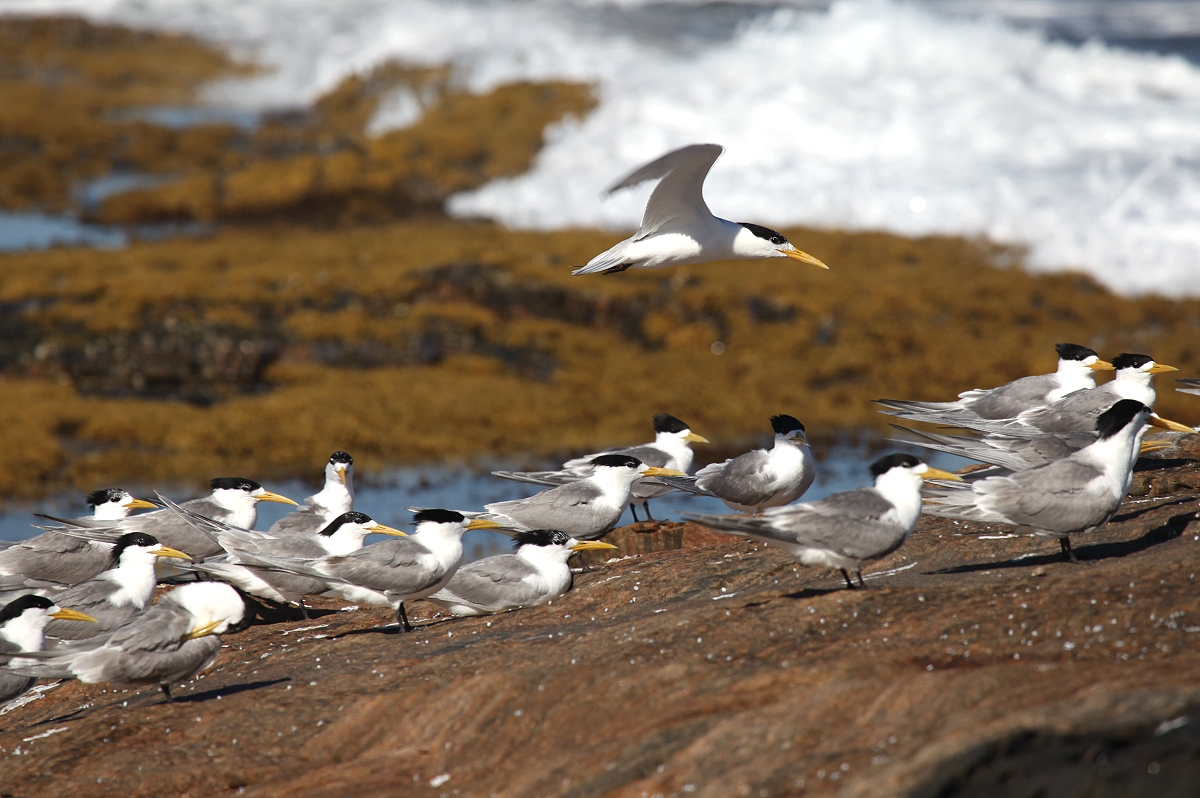 Auch Möwen und Seeschwalben (Caspian Tern, Crested Tern) schossen pfeilschnell vorbei. Außerdem waren wir fasziniert zu sehen, wie die Brandung immer wieder gegen die Felsen anrollte und die schäumende Gischt dabei meterhoch spritzte. |