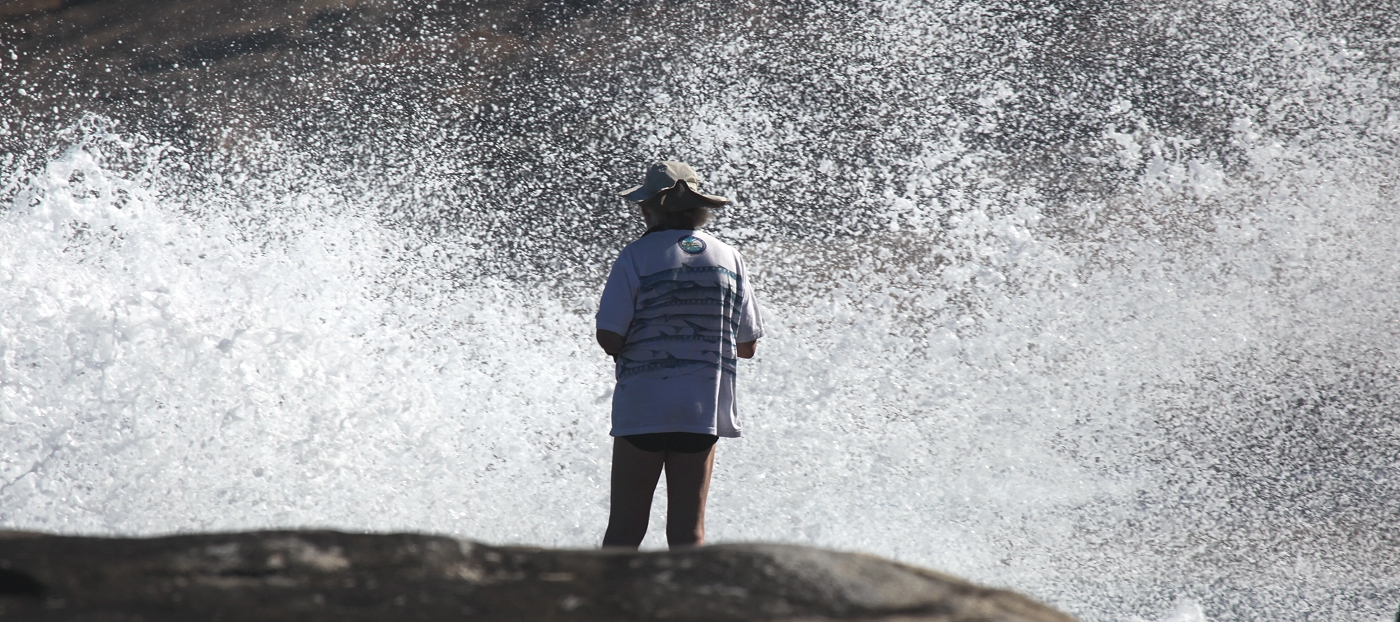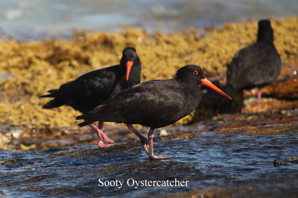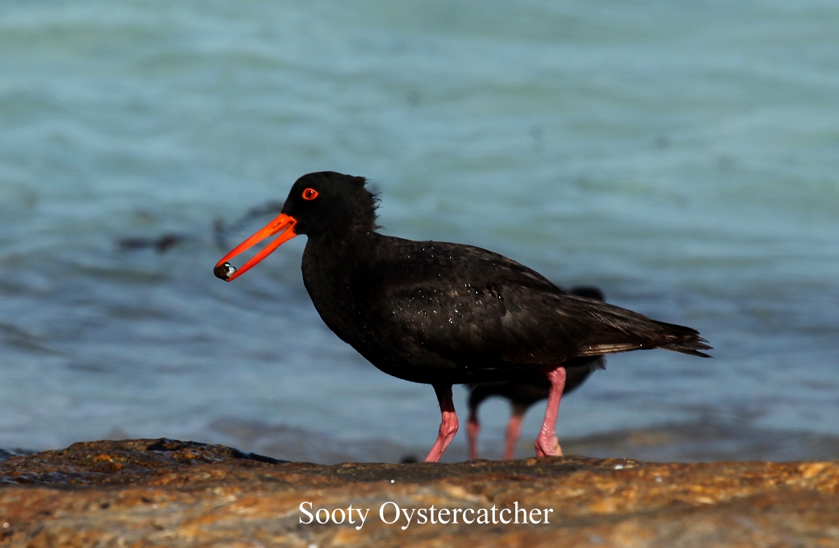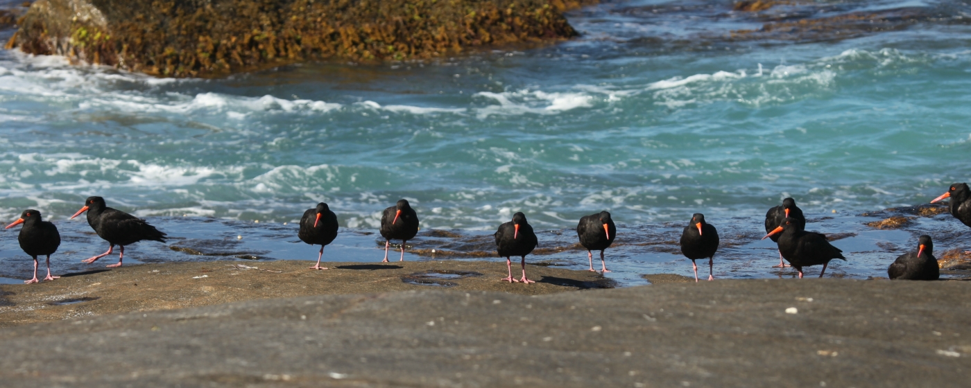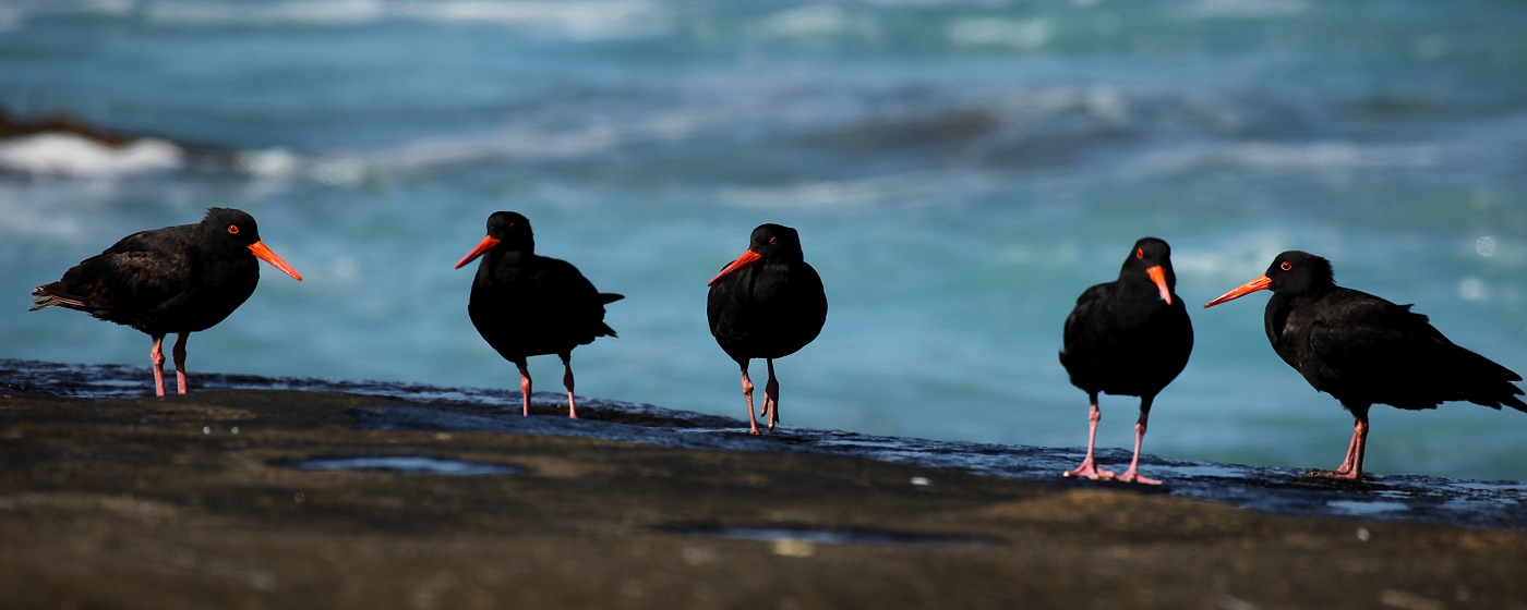 Auf den nahen Felsen hatten sich zahlreiche Austernfischer (Sooty Oystercatcher) versammelt. Fasziniert sahen wir ihnen zu, wie sie immer wieder vor den anrollenden Wellen zurückweichend nach Futter suchten. |
