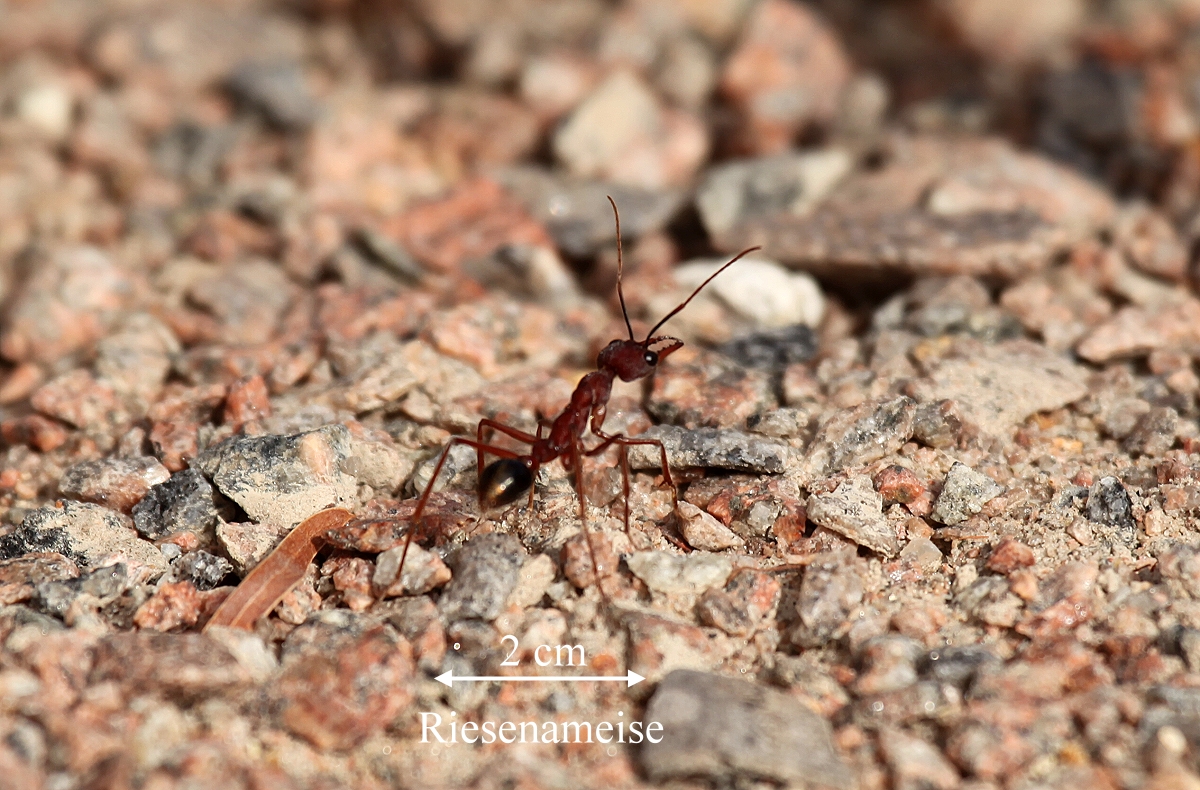 Da hielt es uns nicht länger im Bett und wir standen auf. Tomoko machte gleich eine Runde in die nähere Umgebung. Es war nur 15°, nicht sehr viel. Das Frühstück war wie immer sehr lecker. Auch einige New Holland Honeyeaters kamen immer wieder ganz nah und pickten in den Blüten der Banksia-Pflanzen. Nachdem wir alles abgebaut, gespült und im Auto verstaut hatten, konnten wir gegen 8.30 h losfahren. Vorher hatte ich noch eine wirklich riesige Monsterameise gesehen und fotografiert. Man konnte deutlich die großen Beißzangen sehen. Gut dass die nicht den Weg in unser Auto gefunden hatte... |