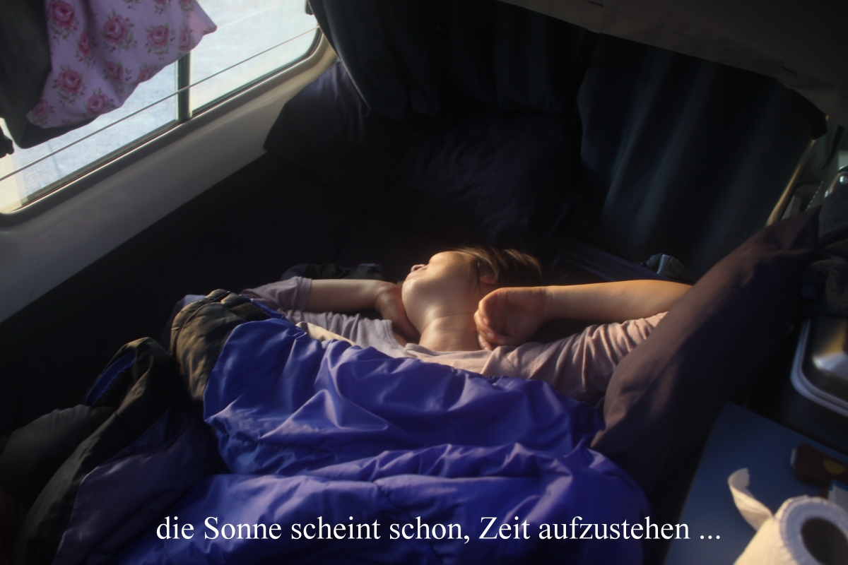 Das schmeckte wirklich wunderbar. Es war inzwischen so kalt geworden, dass wir im Auto zu Abend aßen. Nach dem Spülen blieben wir im Auto sitzen. Ich schrieb mein Tagebuch zu Ende, Tomoko arbeitete noch ein wenig an ihrer Übersetzung. Gegen 21.00 h gingen wir schlafen. |