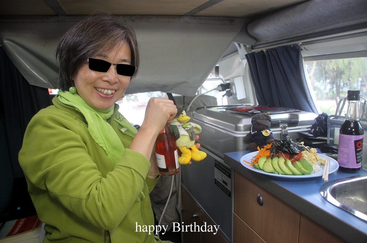 Der Wind frischte zwischendurch immer mal wieder sehr heftig auf, so dass mir beim anschließenden Geschirrspülen die Tassen vom Tisch geweht wurden. Tomoko nutzte die Gelegenheit und duschte ausgiebig. Ich schrieb derweil Tagebuch und informierte mich schon mal über das Straßen- und Wegenetz im Fitzgerald NP. Wir bearbeiteten einige Fotos, die ich anschließend an einige Freunde übers Internet verschickte. Es gab hier tatsächlich einen kostenlosen Internetzugang, nicht sehr schnell, aber für E-Mail reichte es. Tomoko machte inzwischen ein wahres Festtagsessen anlässlich ihres heutigen Geburtstags, Chirashi-Sushi mit allen dafür nötigen Zutaten wie Gemüse (Möhren, Buschbohnen und Avocado), Ei, Reis, Nori-Blätter, Soja-Sauce und Wasabi. Dazu öffneten wir ein Fläschchen Piccolo-Sekt und danach eine Dose Bier. |