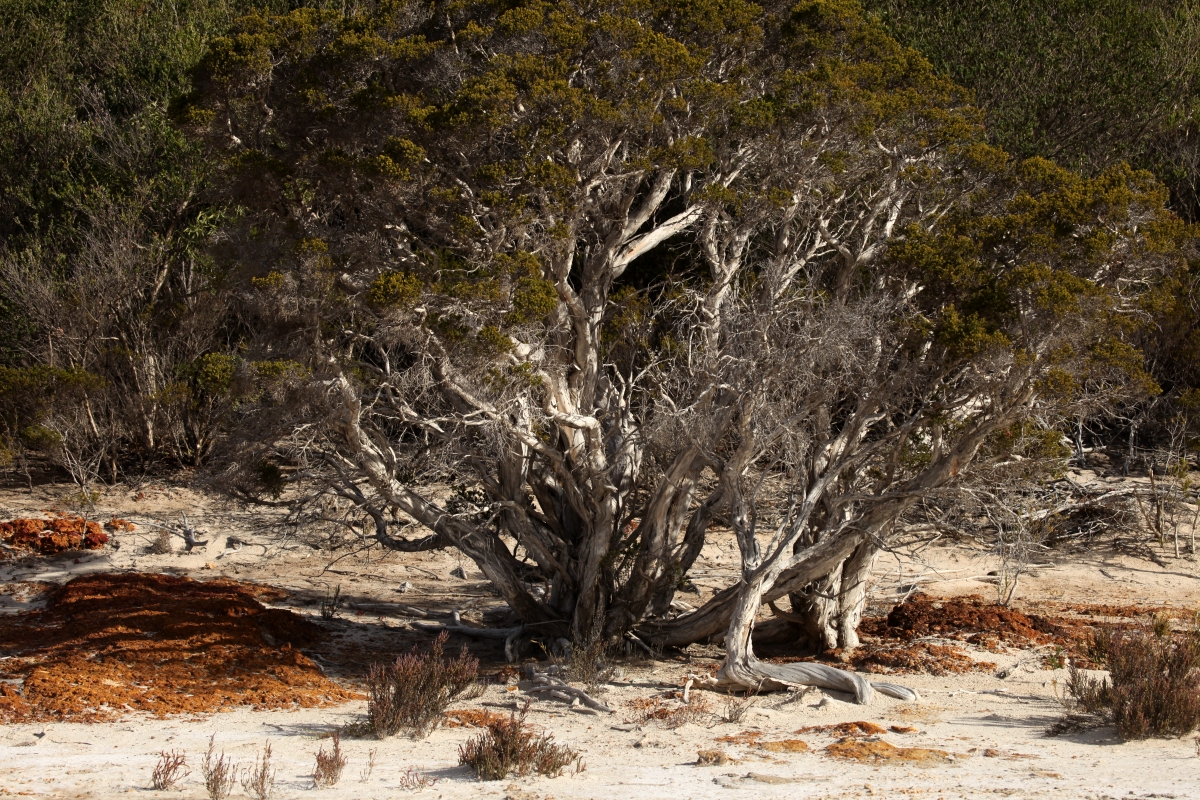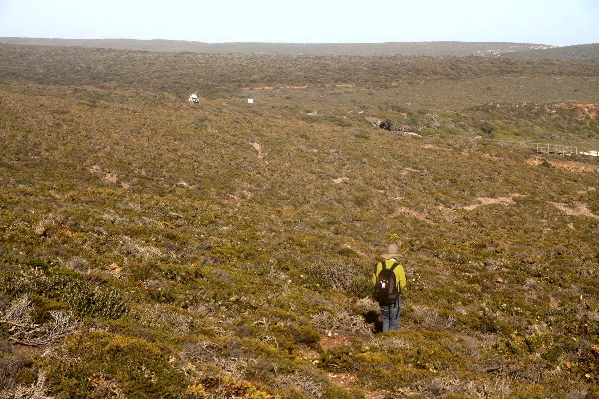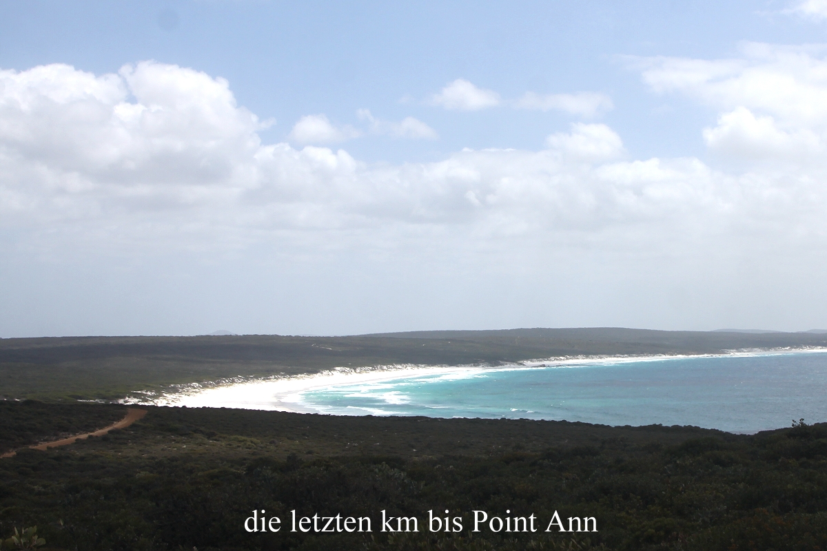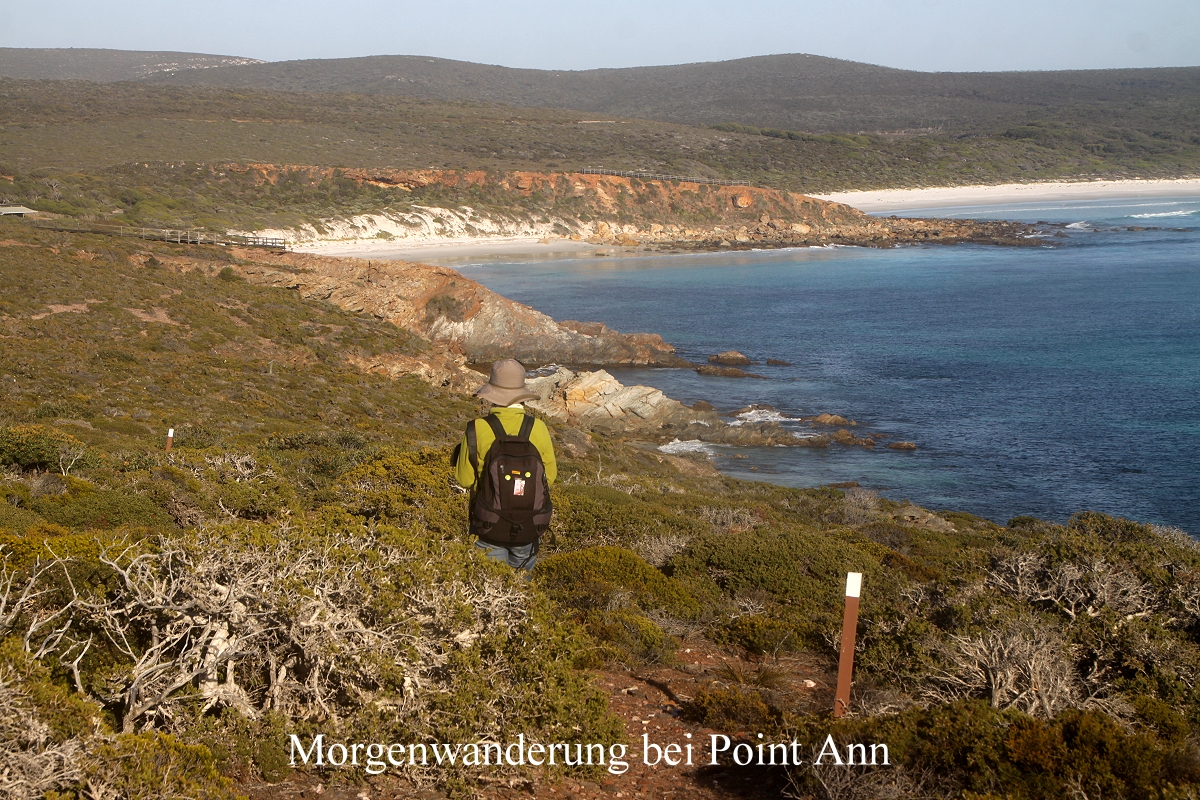Gegen 6.00 h wurden wir wach. Vor dem Frühstück wollten wir erst eine kleine Morgenwanderung unternehmen. Schnell zogen wir uns an, bauten das Sonnendach ab und legten alles auf einem Haufen zusammen. Dann fuhren wir die ca. 2 km bis Point Ann, einem kleinen Kap, wo ein Rundweg abzweigte. Um 6.30 h kamen wir dort an. Kein Wölkchen war zu sehen. Die Sonne strahlte schon kräftig, aber die Lufttemperatur betrug nur kühle 14°. Wir benötigten für den Rundweg ungefähr eine Stunde. |