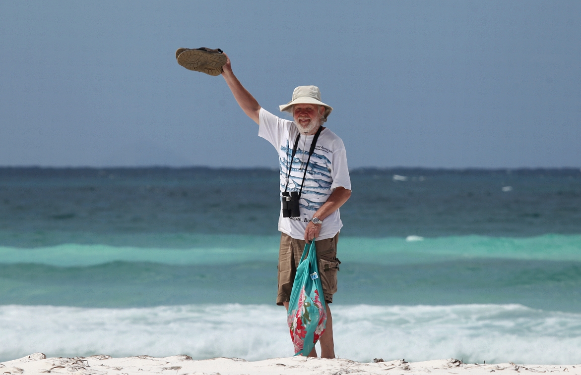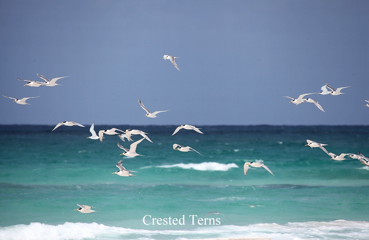 Ich legte meine Kleidung ab und marschierte schnurstracks in die Wellen. Die Brandung war etwas stärker als gestern in Quagi Beach, das Wasser auch hier kristallklar. Tomoko wanderte derweil mit ihrer Kamera im hinteren Bereich des Strandes herum auf der Suche nach einem hier brütenden seltenen Vogel, dem Hooded Plover. Leider fand sie keinen. Stattdessen fotografierte sie die Seeschwalben (Caspian Tern, Crested Tern) und andere kleine Dinge, die ihr so auffielen. |