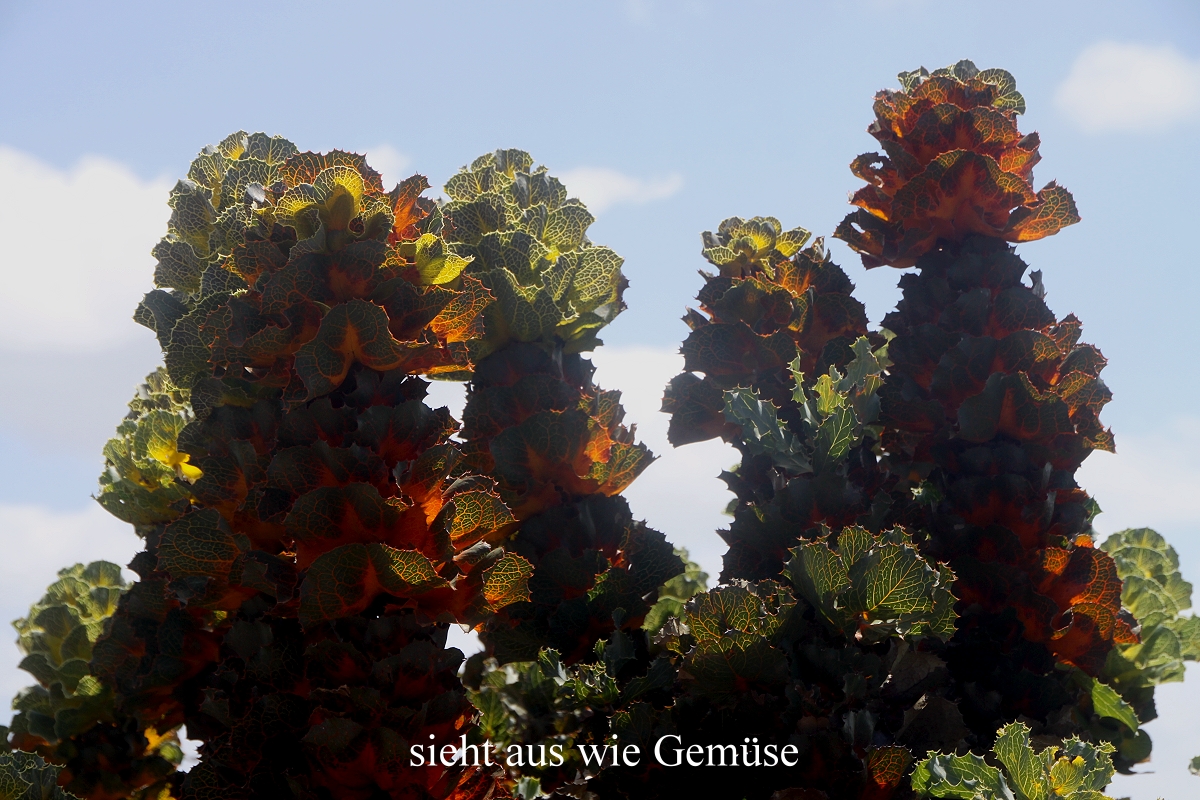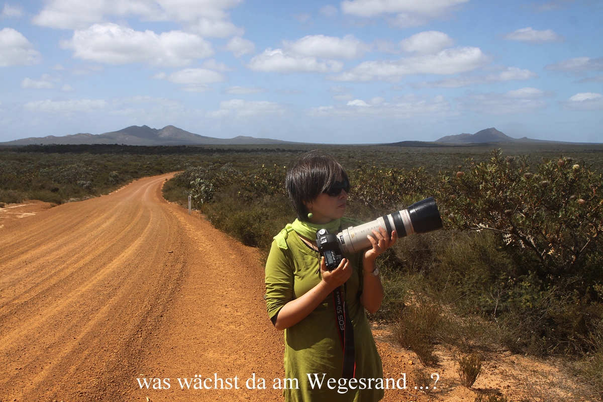 Da uns plötzlich drei Autos entgegen kamen, übrigens die einzigen auf der gesamten Strecke, scheuchte Tomoko den Waran schnell in die Büsche. So konnten wir ihn wahrscheinlich vor dem überfahren werden retten. Ein Raubvogel saß in einiger Entfernung auf einem Baum. Gegen das Licht war er schwer zu bestimmen, vielleicht hilft ja ein Belegfoto. Wieder ein Stück weiter plötzlich fünf schwarze Papageien knapp über den Büschen fliegend, dann in einiger Entfernung in einem Strauch landend. Es waren Short-billed Black Cockatoos oder auch Carnaby`s Cockatoo genannt. Am Straßenrand standen immer wieder Pflanzen, die uns an eine Kohlart erinnerten, sie waren jedoch sehr stachelig. |