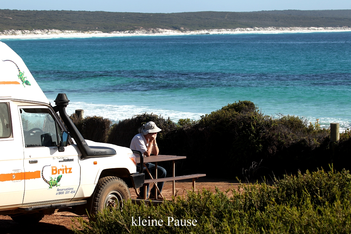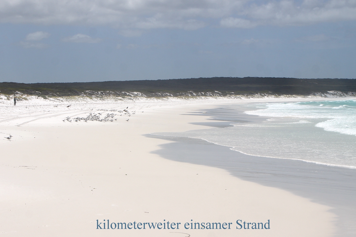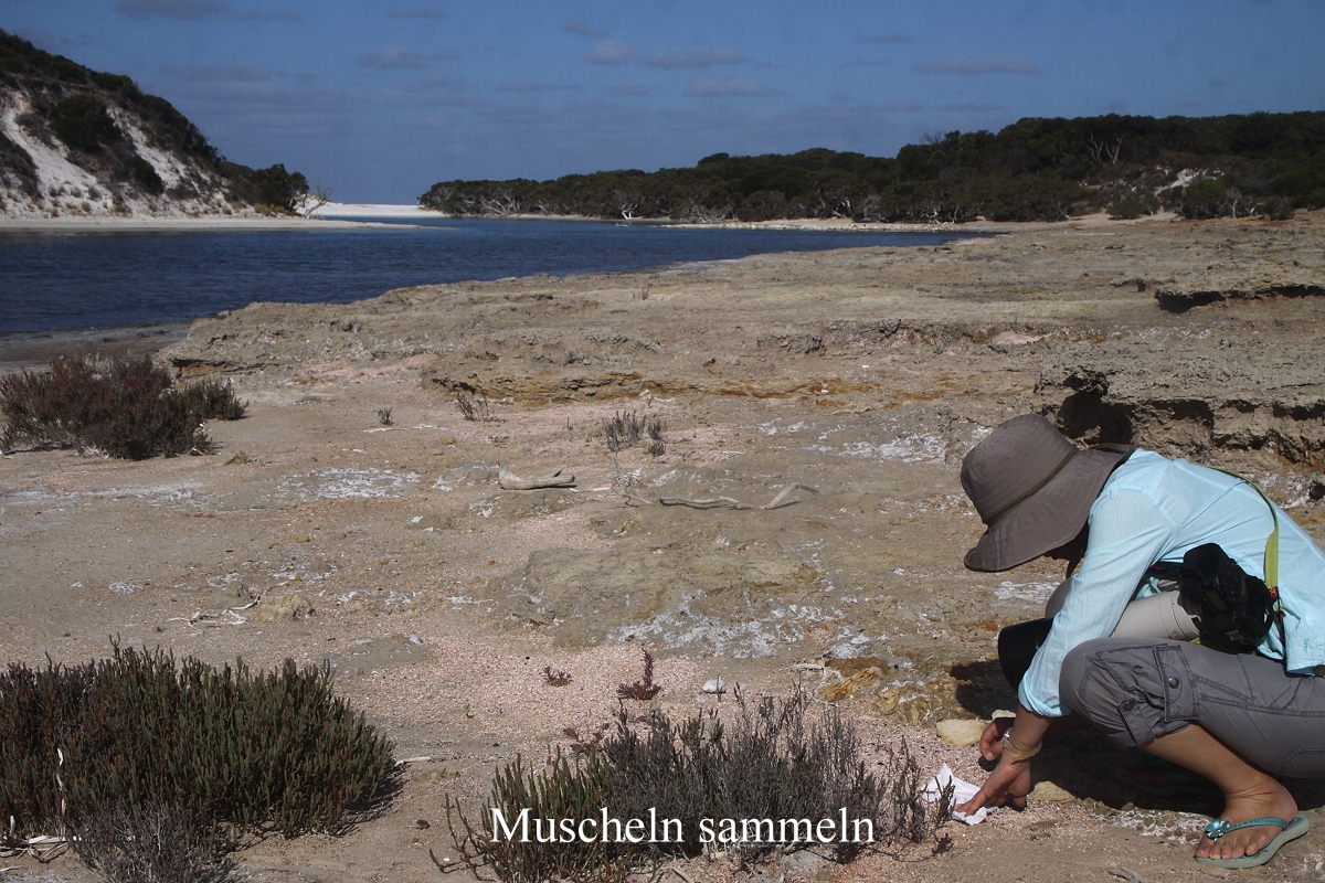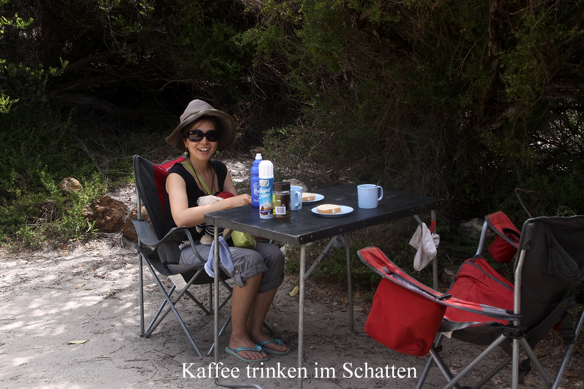 Ich baute sofort das Sonnendach an, so dass wir etwas Schatten hatten. Eine sehr freundliche Australierin begrüßte uns. Sie war auf dem Weg zur zweiten Toilette hier, auf der ersten hatte sie diese Nacht eine Schlange getroffen, na dann…Da Tomoko Hunger hatte, bereitete sie einen "Cold Slaw" vor, eine Art Krautsalat. Dazu gab es zu meiner und Entelchens Überraschung schon ein kühles Bier zu dieser frühen Uhrzeit. Na ja, ich hatte ja Namenstag heute, warum also nicht…Wir stellten fest, dass wir heute Morgen vergessen hatten, unsere Solardusche mit frischem Wasser aufzufüllen und da wir auch nicht mehr ganz so viel Wasser im Tank haben, müssen wir ein wenig mit Wasser sparen. Schaun wir mal…Gegen 12.30 h war die Temperatur inzwischen auf 33° gestiegen und da zwischen den dichten Büschen kaum ein Wind spürbar war, wurde es uns ziemlich warm, so dass wir uns ein wenig leichter anzogen und mit Sonnenöl einrieben. Dann machten wir uns auf zu einem kleinen Spaziergang zum Strand, der vielleicht 200m entfernt liegt. Der schneeweiße Strand blendete unsere Augen. Er erstreckt sich mehrere km in beide Richtungen. Es waren nur zwei Fischer da, die ihre Angeln ins Meer ausgeworfen hatten. |