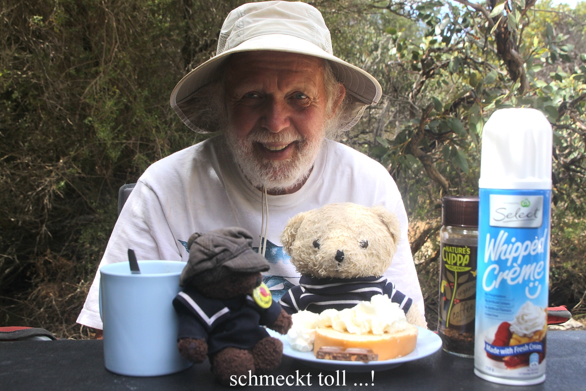 Bei einem Wassertank an einem Grillplatz konnten wir unsere Solardusche mit frischem Regenwasser auffüllen, was deutlich besser war als die Salzbrühe von gestern. Zurück an unserem Stellplatz machte Tomoko ein opulentes Frühstück mit viel French Toast, den wir mit Schlagsahne noch verfeinerten. Das Toast-Brot war leider etwas schimmelig geworden und wir mussten einige Stücke herausschneiden. French Toast zu braten schien uns aber die beste Möglichkeit, das Brot doch noch für den Verzehr zu retten. |