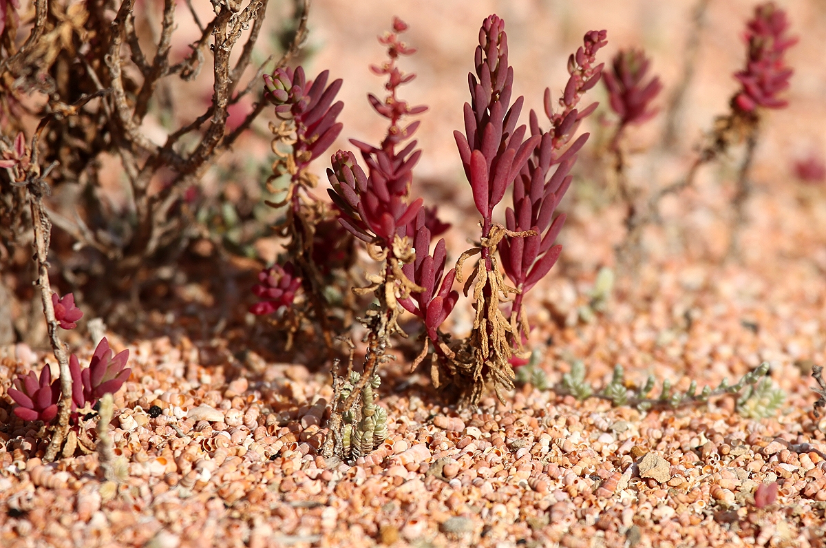 Der Boden ist teilweise mit einer Salzkruste bedeckt. Interessante Pflanzen wachsen auf diesem Boden. An einer Stelle fanden wir unglaublich viele winzige Muscheln, deren Zahl in die Millionen geht. |