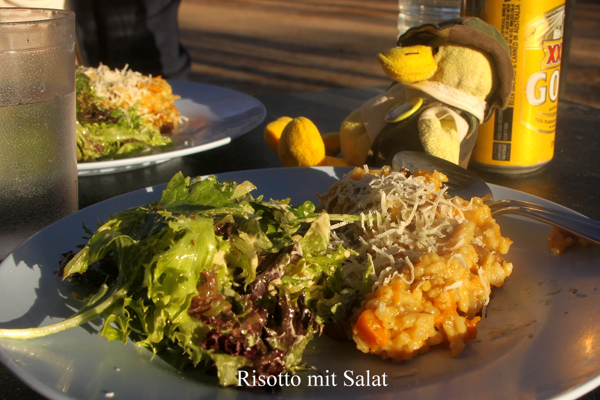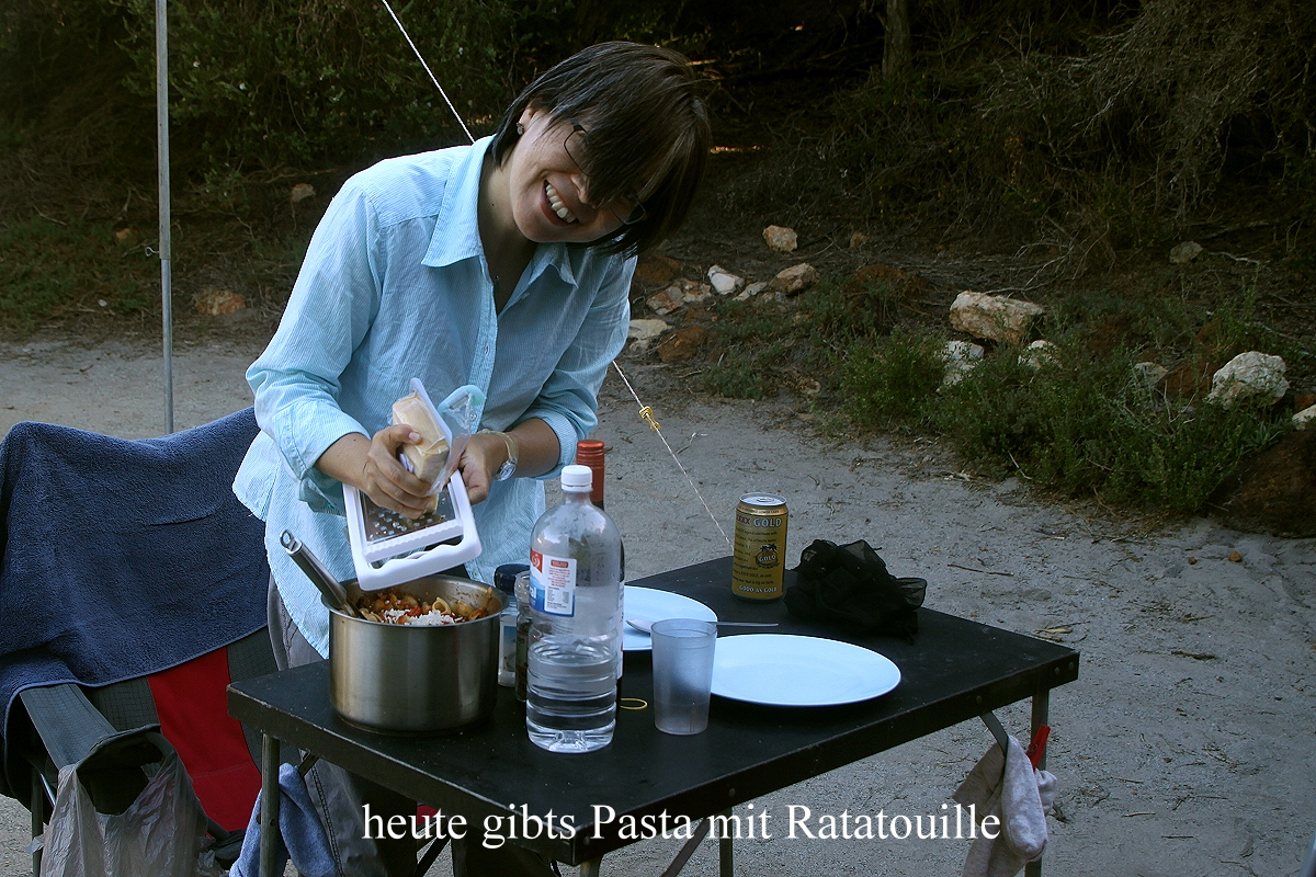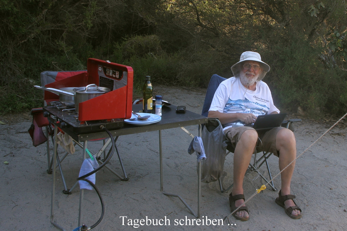Gegen 18.00 h gingen wir langsam zurück. Tomoko kochte noch Pasta und bei einem Glas Rotwein, bzw. Bier für Tomoko, genossen wir das schmackhafte Abendessen in der frischen Luft. Tomoko spülte anschließend, auf sehr Wasser sparende Weise, das Geschirr. Als ich von einem Gang zur Toilette zurückkam, war sie gerade dabei sich zu waschen mit Hilfe eines Waschlappens und Wasser, abgefüllt in unserer kleinen Plastikwanne. Nun war ich dran. Diese Methode war erstaunlich effektiv. Das ganze klebrige Salz war weg und ich fühlte mich wunderbar erfrischt, toll… Nun wurde es aber langsam Zeit mit Tagebuch schreiben weiterzumachen. |