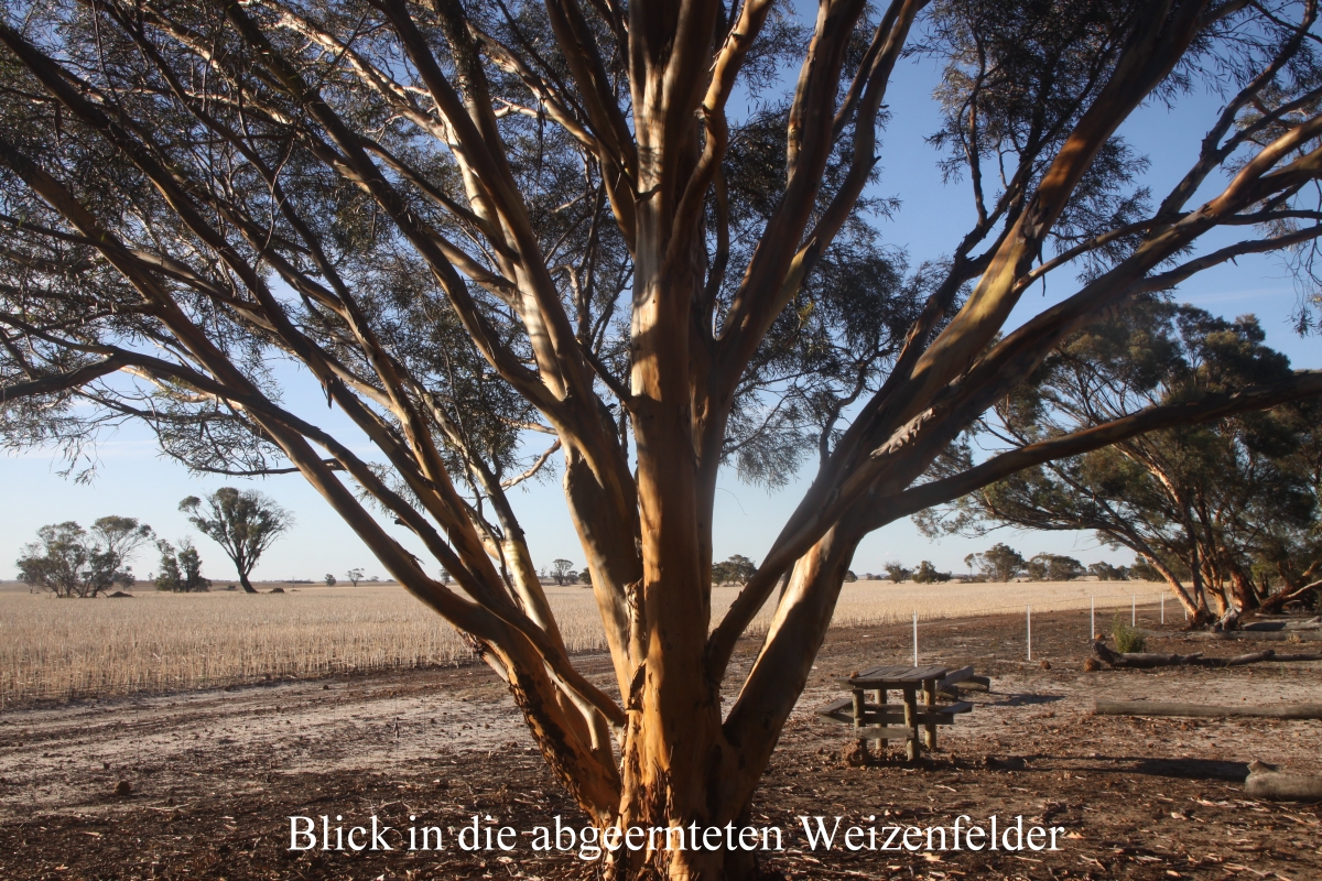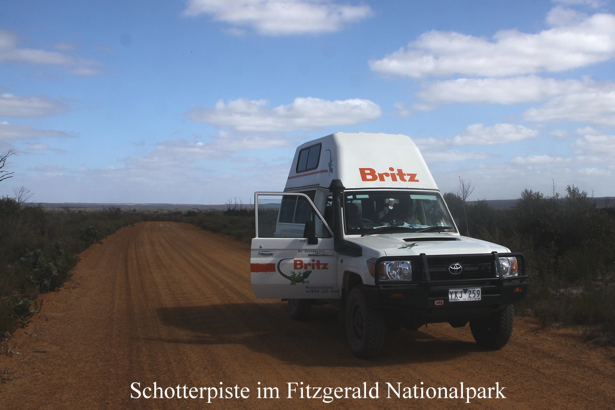 Um 7.30 h waren wir schon startbereit. Bei der Rezeption hielten wir für 15 min an und schickten noch ein paar E-Mails los. Dann ging es los Richtung Fitzgerald Nationalpark. Nach ein paar km tauchten links von der Straße hoch in einem Baum 8 Papageien auf, offensichtlich Regent Parrots. Sie saßen sehr hoch in den Bäumen, so dass es schwierig wurde ein Foto zu machen. Nach 16 km erreichten wir die Abzweigung in den Nationalpark. Ab hier geht es auf einer Geröllpiste (Quiss Road) ca. 60 km durch den Park bis ans Meer. |