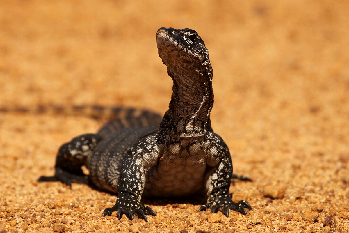 Drei Black-shouldered Kites begegneten uns als erstes. Es folgten zwei Adler (Wedge-tailed Eagle). Wir fuhren extrem langsam, nur ca. 40 km/Std. um möglichst kein Tier zu überfahren. Nachdem wir an zwei toten Waranen vorbeigefahren waren, trafen wir um 9.30 h auf einen lebendigen. |