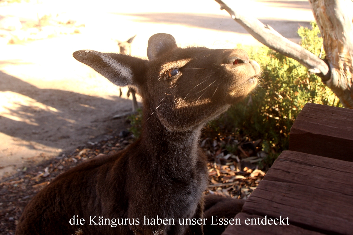 Gerade als wir uns gemütlich auf der Bank niedergelassen hatten, sah ich in einiger Entfernung, wie ein Mann Kängurus mit einem Tuch wegjagte. Was ich befürchtet hatte, trat ein, die Kängurus kamen in großen Sprüngen herangehoppelt und versuchten jetzt bei uns etwas abzubekommen. Wir machten zwar ein paar Fotos, doch für ein gemütliches Frühstück war das nichts. Ich nahm meine Serviette drohend in die Hand. Das wirkte offensichtlich, denn die Kängurus zogen langsam davon. |