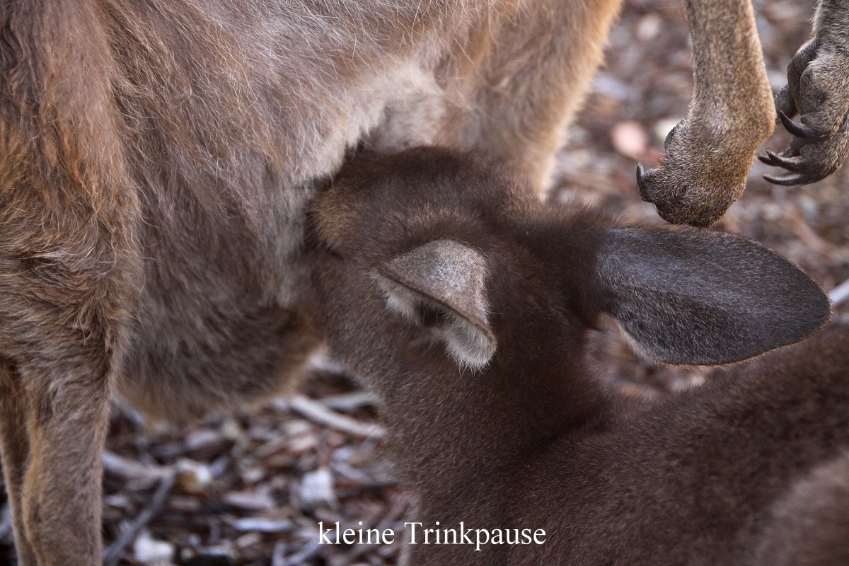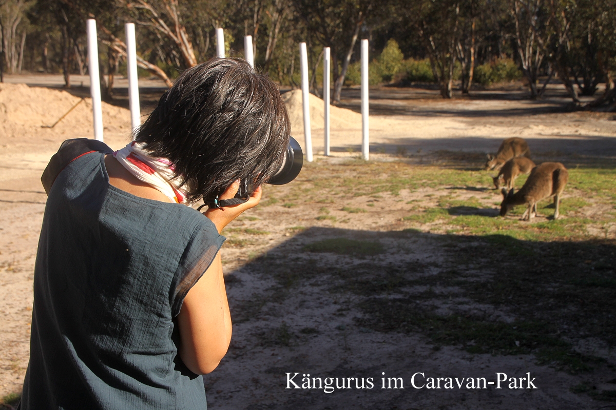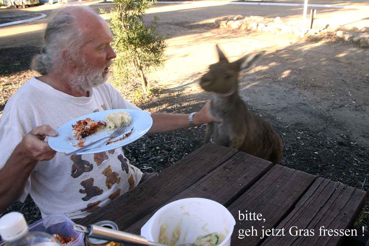 Wir erhielten den gleichen Platz wie vorgestern. Da die Zeit schon zu weit fortgeschritten war, verschoben wir unsere geplanten Besorgungen, Einkaufen und Post, auf morgen. Tomoko wusch in der Laundry gleich mal wieder schmutzige Wäsche und duschte anschließend. Um 17.20 h stand das Abendessen fertig auf der Holzbank neben unserem Auto. Als wir uns setzten, kamen die 3 Kängurus, die wir schon bei der Ankunft fotografiert hatten, plötzlich ganz nah heran. Sie wollten gerne etwas von unserem leckeren Kartoffelsalat und dem restlichen Ratatouille von gestern abbekommen. Besonders eins kam ganz nah zu uns heran, so dass ich es streicheln konnte. Es war ziemlich aufdringlich, kam mal von links, mal von rechts, kam sogar mit dem Kopf auf den Tisch. Einige Momente hielt es ganz still, als ein kleines Känguru, offensichtlich ihr Junges, kam um an seiner Brust zu säugen. Für diese wenigen Minuten hatten wir etwas Ruhe. Doch das dauerte nicht lange und das Spiel ging von vorne los. |