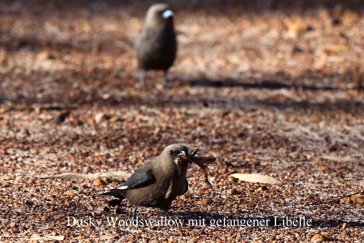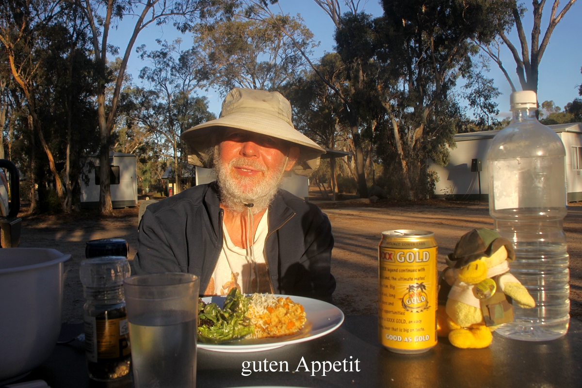 Nun war es aber Zeit unseren obligatorischen Kaffee zu machen. Den genossen wir mit diversen Plätzchen sowie einigen Profiteroles, die aber Tomoko nicht so sehr schmeckten, obwohl wir sie mit Himbeermarmelade und Schlagsahne (Patsch) veredelt hatten. Sie waren ziemlich trocken und muffig, offensichtlich schon zu lange im Laden gelegen. Nachdem wir nochmals eine kleine Runde über das Gelände gemacht hatten, wurden wir beide ziemlich müde. Tomoko schlief etwas im Auto, während ich auf meinem Sessel kurz einnickte und dabei fast vom Stuhl gekippt wäre. Um 15.00 h fing Tomoko schon mit den Vorbereitungen fürs Abendessen an. Zunächst machte sie einen Gurkensalat, dann mischte sie Kürbisstücke mit Steinpilzen. Während der ganzen Zeit wurden wir heftig von kleinen Fliegen attackiert, so dass wir beide unsere Fliegennetze über den Kopf zogen. So ließ es sich einigermaßen aushalten. Die sanitären Anlagen auf diesem Campingplatz sind vorbildlich sauber und gepflegt. Man merkt deutlich, dass die Besitzer sich Mühe geben. Man kann den Platz wärmstens empfehlen. Gegen 17.00 h war Tomoko mit dem Kochen fertig und wir machten wieder einen kleinen Rundgang. Das Licht war jetzt sehr weich, aber es blieb ganz ruhig, keine Vögel in Sicht. Tomoko fühlte sich wegen einer beginnenden Migräne ziemlich schwach. Also wanderten wir auch nicht allzu lange. Als wir gegen 17.45 h zurückkamen, wurde es plötzlich lebhaft. Etliche Vögel ließen sich sehen. Zwei Restless Flycatcher, neu für uns, flogen ihrem Namen entsprechend ziemlich hektisch umher. Auf mehreren Bäumen konnten wir wieder Elegant Parrots beobachten. Auch die Dusky Woodswallows waren wieder aktiv. Tomoko, die eigentlich die Toilette aufsuchen wollte, konnte sich gar nicht losreißen. |