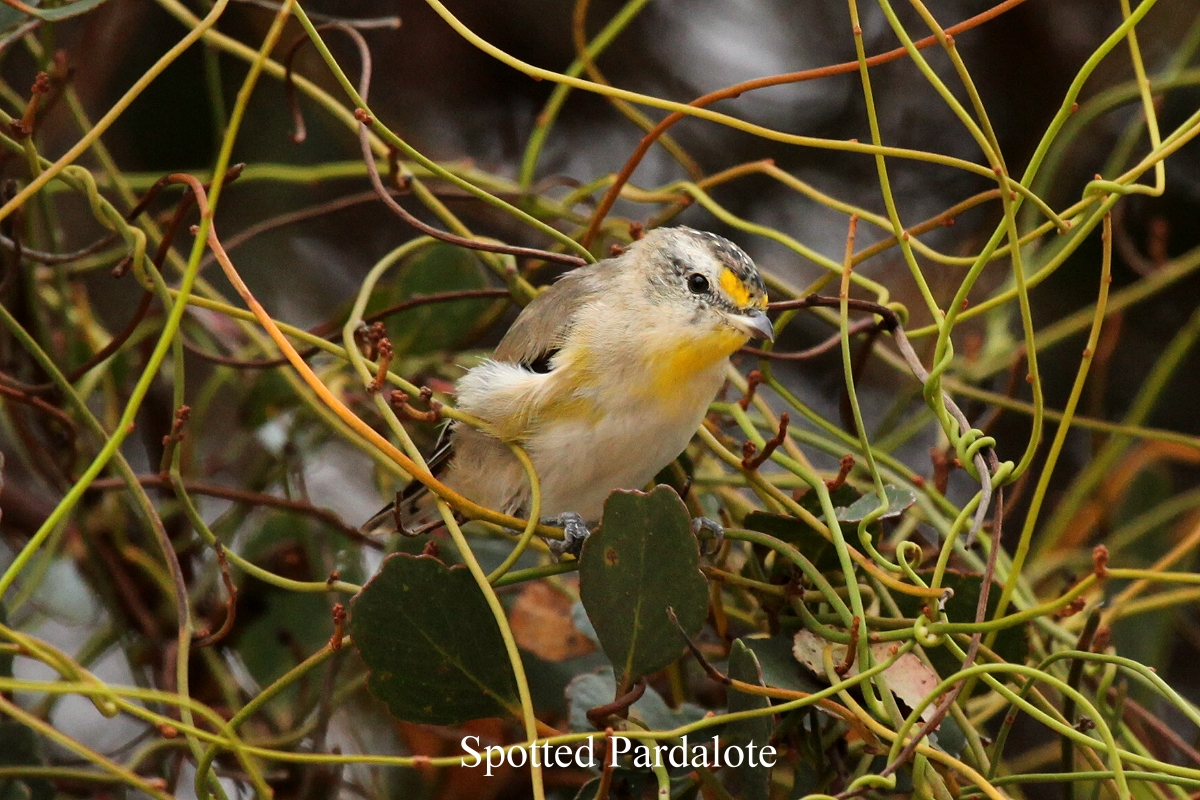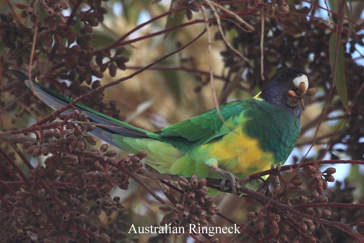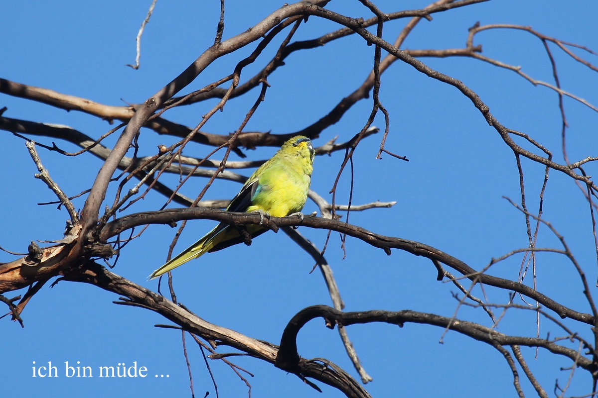 Auch ein Schwarm Elegant Parrots saß in den nahen Büschen. Oben kreisten etliche Schwalben in den Lüften. Auch einen Yellow-plumed Honeyeater konnte Tomoko fotografieren. |
