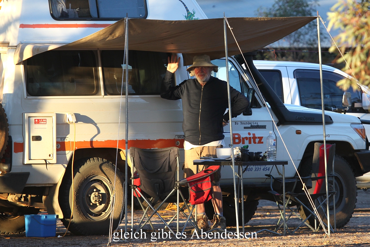 Um 5.50 h wurden wir wach. Der Himmel war strahlend blau, kein Wölkchen war zu sehen. Schon während der Nacht konnten wir sehen, wie der Vollmond bei wolkenlosem Nachthimmel die Umgebung in ein helles Licht tauchte. Die Sonne schien zwar schon, doch es war noch ziemlich frisch, nur 12°. Deshalb nahmen wir zum ersten Mal auf dieser Reise unser Frühstück im Auto ein. Vorher hatte ich die Gelegenheit genutzt, nochmals heiß zu duschen, was in der wirklich sauberen Anlage ein Vergnügen war. Drei Kängurus besuchten uns, während wir frühstückten. |