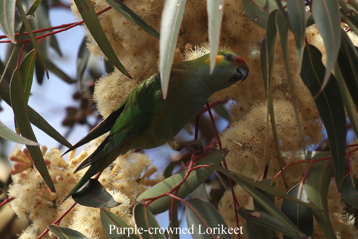 Der Himmel war bewölkt, doch es war windstill und mit 21° nicht sehr kalt. Um 8.15 h hatten wir alles eingepackt und fuhren los, zunächst zur Post. Diese machte aber erst um 9.00 h auf, so dass wir erst in einen kleinen IGA-Supermarkt fuhren und dort einige Lebensmittel, Wasser und ein Medikament für Tomoko kauften, die wieder über Halsschmerzen klagte. Anschließend tankte ich noch voll. Gleich nebenan standen einige Eukalyptusbäume, in denen Tomoko inzwischen etliche Vögel entdeckt hatte (Purple-crowned Lorikeet, Australian Ringneck, Yellow-throated Miner und Western Wattlebirds), die versuchten, die Papageien zu verjagen. Die Bäume trugen viele Blüten, um deren Nektar sich die Vögel stritten. |