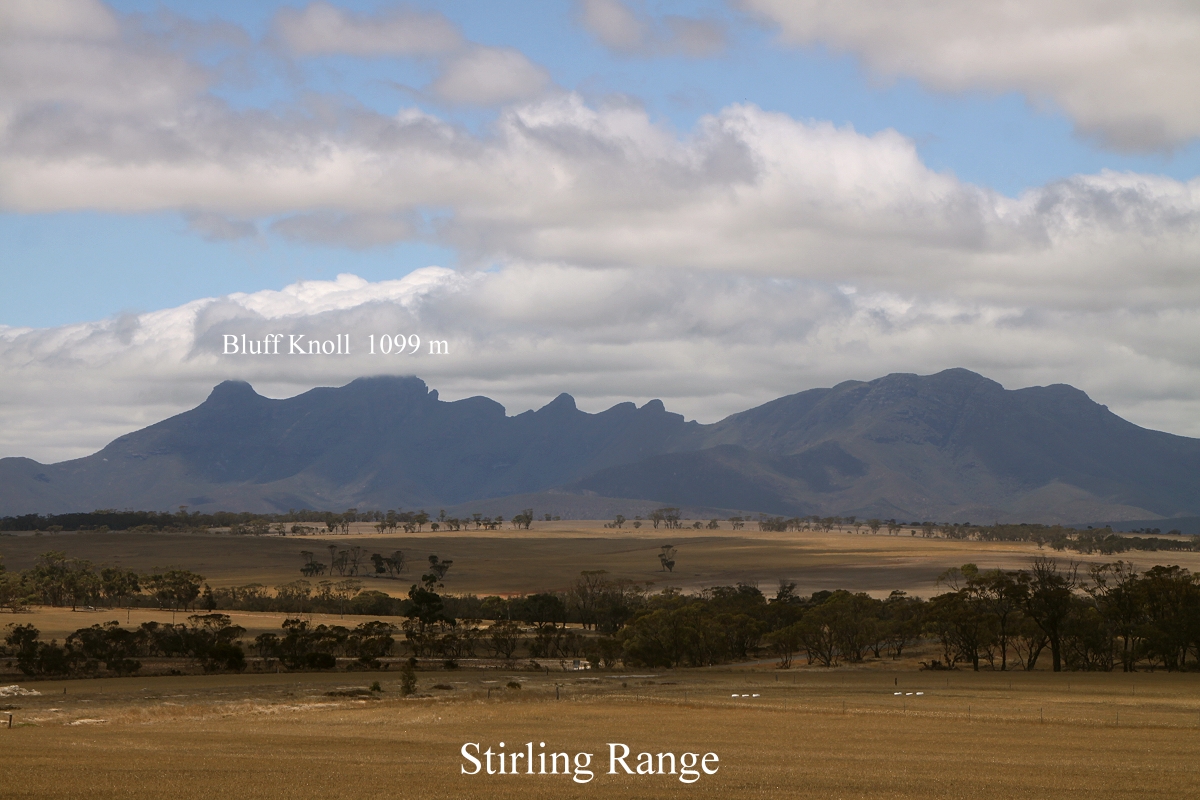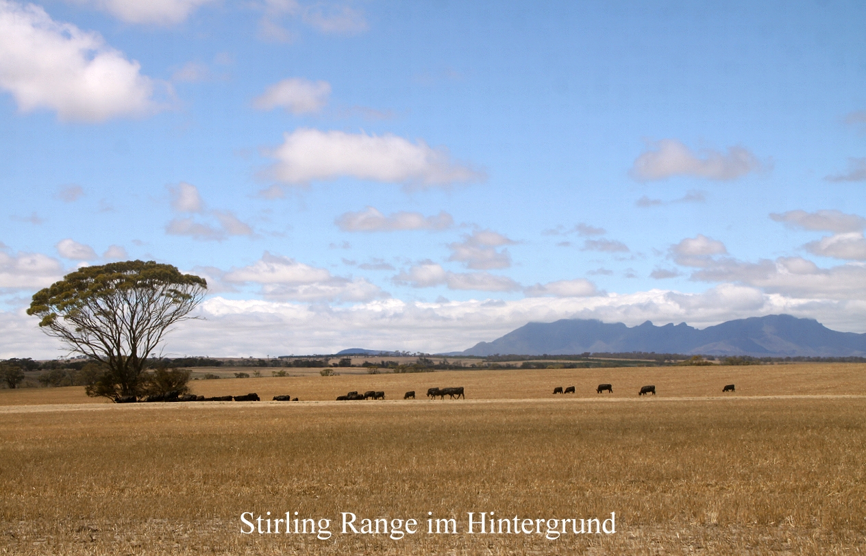 Um 9.15 h waren wir endlich abfahrbereit. Wir fuhren weiter zunächst Richtung Westen ca. 60 km, dann bog die Straße nach Süden ab. Die Bewölkung lockerte mehr und mehr auf und es wurde zusehends wärmer. Die Landschaft war etwas langweilig. Wir durchfuhren den südlichen Teil des Wheatbelts, also endlose schon abgeerntete Weizenfelder links und rechts. Vor uns tauchte nun die Silhouette der Stirling Range auf, deren höchster Gipfel Bluff Knoll (1099 m) noch von Wolken verhüllt war. |