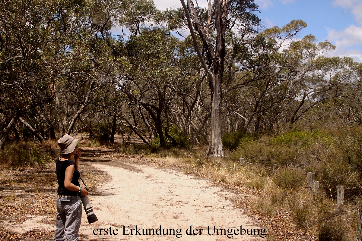 Um 11.30 h erreichten wir dann nach genau 100 km Fahrt unser heutiges Ziel, den Stirling Range Nationalpark. Gleich am Eingang fanden wir einen schönen Caravan-Park. Eine sehr nette Frau empfing uns an der Rezeption und als sie hörte, dass wir an Vogelbeobachtung interessiert sind, gab sie uns gleich eine Liste der hier vorkommenden Vögel. Auch etliche Postkarten mit diversen Vögeln aus der hiesigen Umgebung lagen auf der Empfangs-Theke. Wir buchten erst mal für eine Nacht einen Platz mit Strom und Wasser (Powered Site) für 32,- $. Da wir uns den Platz aussuchen konnten, wählten wir eine Stelle am Rand unter hohen Eukalyptusbäumen. Ich baute alles auf und da die Sonne inzwischen heiß vom Himmel brannte, fixierte ich auch unser Sonnendach an der Seite des Autos, so dass wir ein schattiges Plätzchen hatten. |