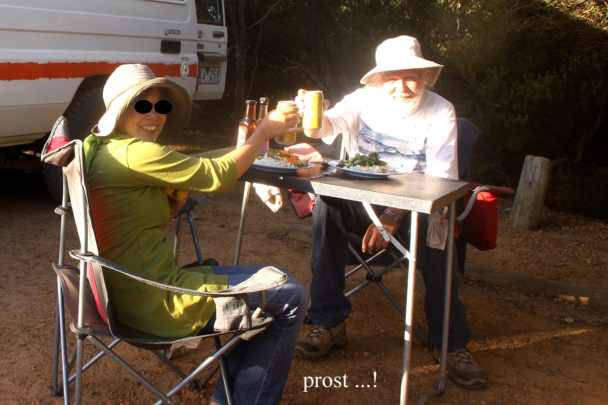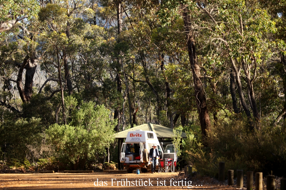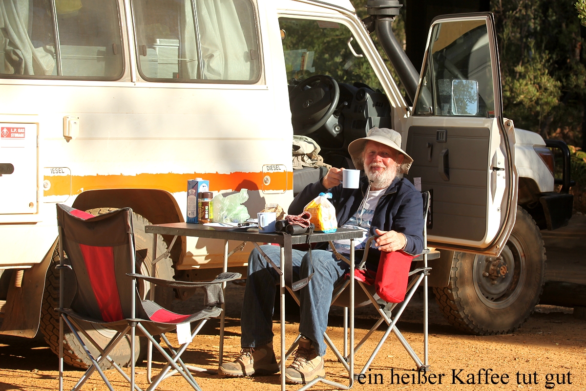 Da aber zunächst nichts weiteres passierte, packten wir unsere Campingmöbel aus und bereiteten uns erstmal ein Frühstück. Auch zwei Kängurus hoppelten durch die Büsche. |