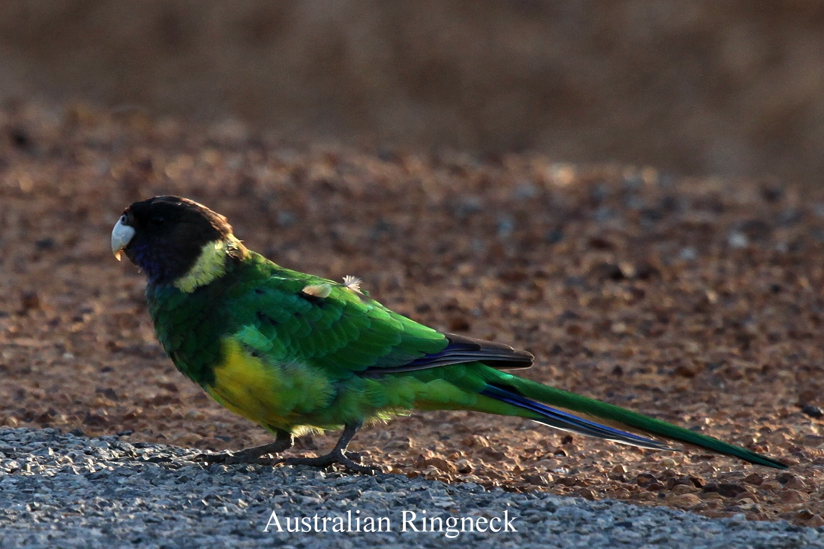 Es war noch ziemlich kalt, so dass wir unsere warmen Jacken angezogen hatten. Zunächst rührte sich wenig. Tomoko ging ein wenig zurück, während ich die nahe Umgebung inspizierte. Tomoko konnte Western Rosellas und Australian Ringnecks am Straßenrand fotografieren. |